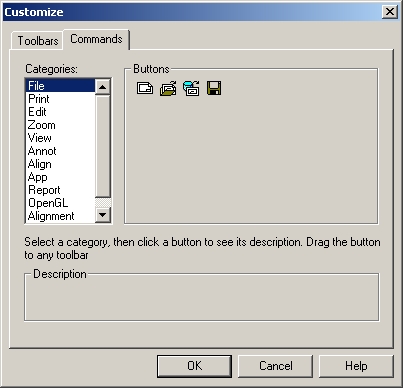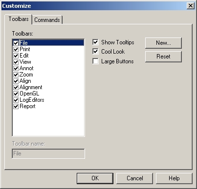 A new toolbar can be created by clicking New, typing a name for your toolbar, and clicking OK. The new toolbar will appear in the User Interface. Buttons can be added to the new toolbar using the Commands tab. Select the Commands tab, then select a name of a toolbar from the list. The buttons will appear to the right. Click and drag the buttons to add them to the new toolbar.