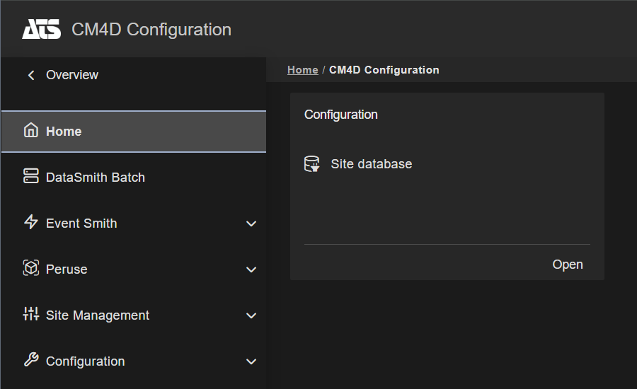 The Configuration tab contains settings for connecting to the CM4D Site database, configuring service endpoints and minor licensing settings.