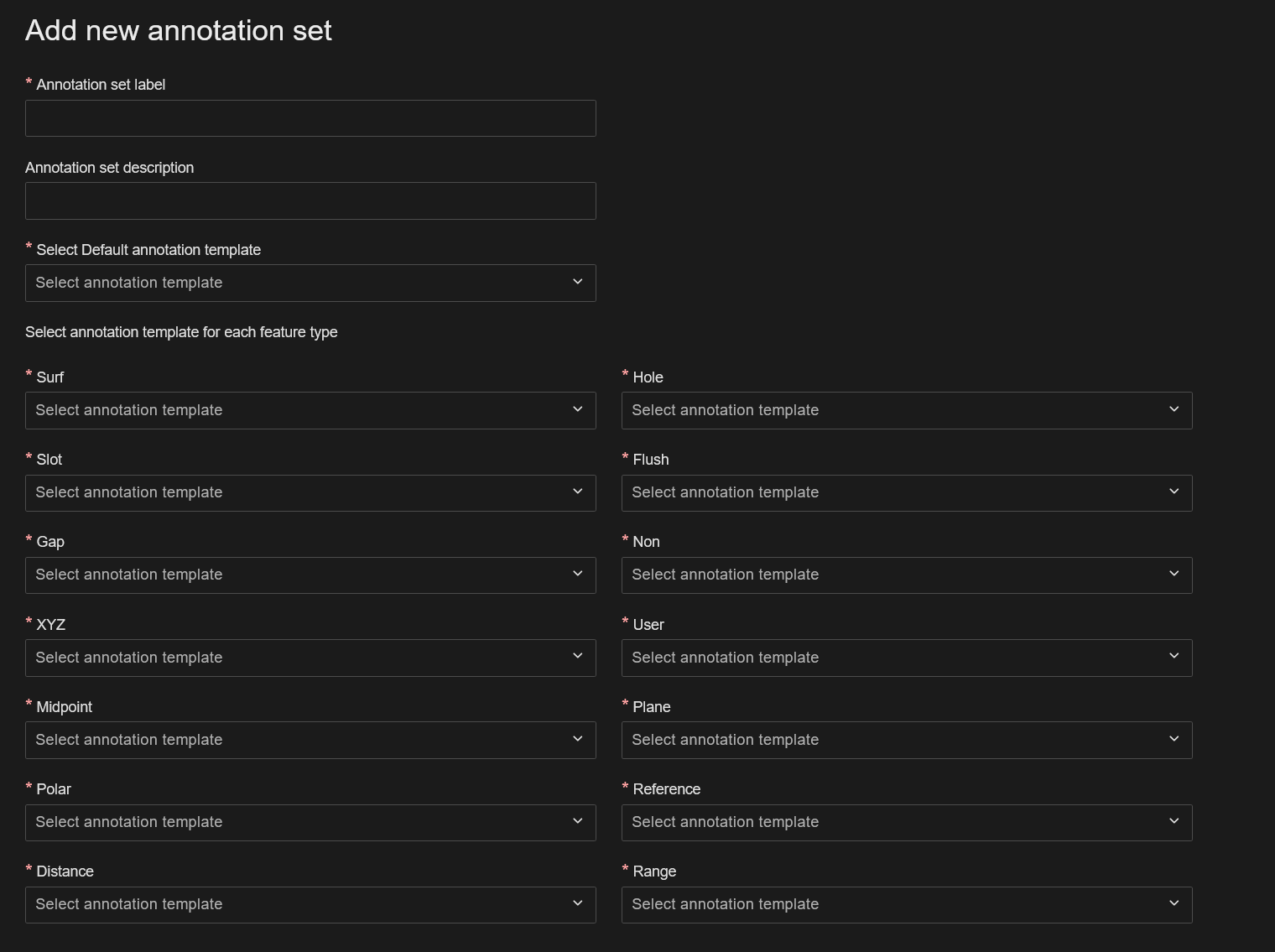 Annotation Sets are defined by assigning a Annotation Template for all Feature types or by selecting a Annotation Template for a individual Feature type.