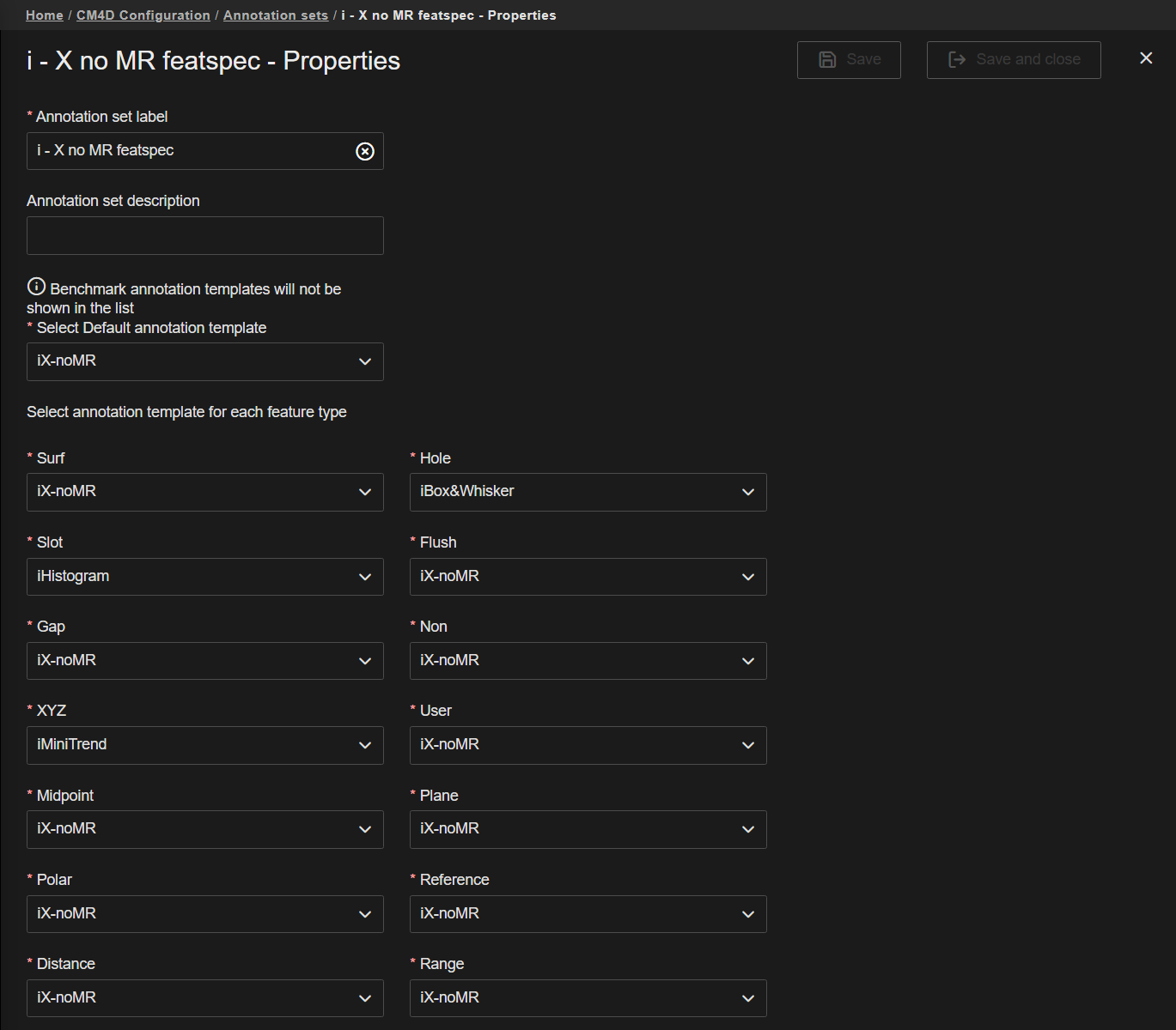 Select a template from the dropdown to assign to all Feature types. Changing the Default annotation template for a set only automatically changes the feature types that are set to the default template. Any of the feature types set to a different template are not modified automatically if the default template is changed. |