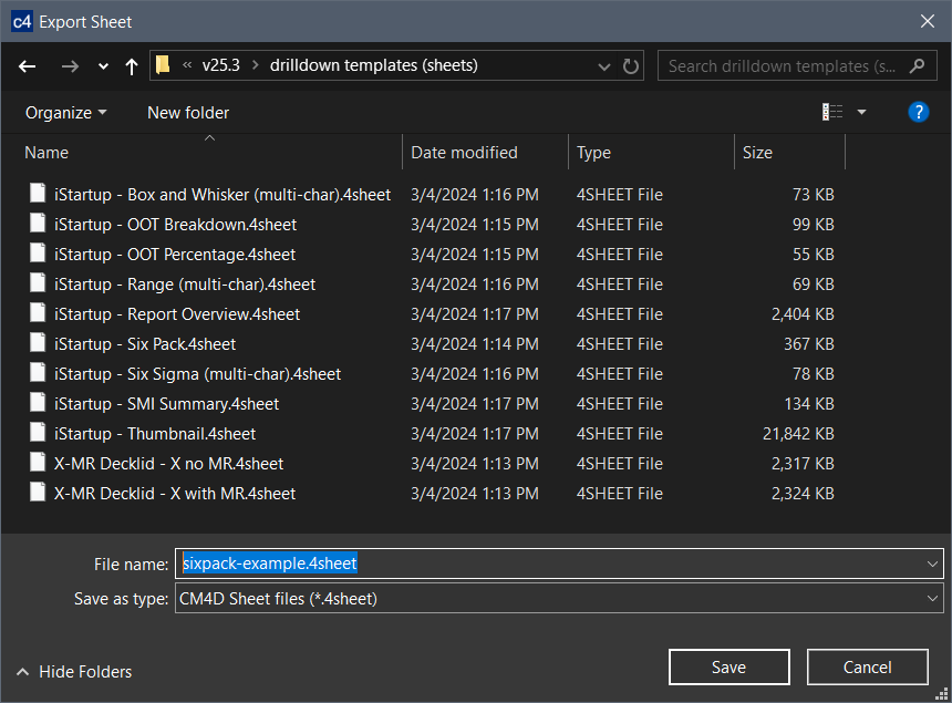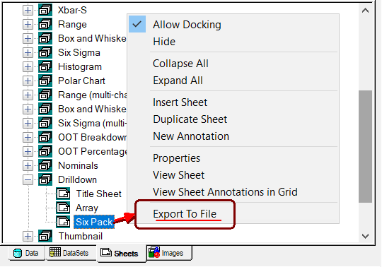 To export a sheet as a template file, right-click on the sheet in the Sheet Tree and select Export to file. This saves the sheet template with a *.4sheet file extension. If any changes are made to the sheet in Classic, an updated template file can be re-imported to overwrite the previous version.