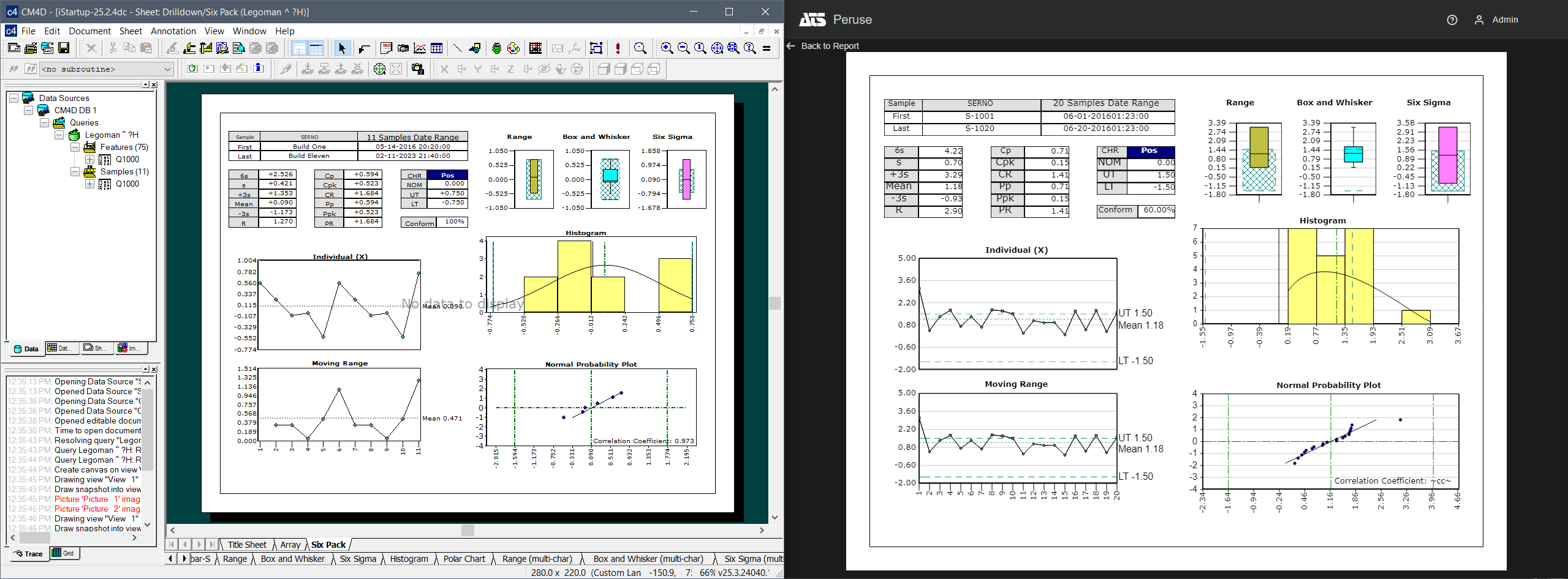Sheets set up in CM4D Classic (Left) are exported and used as Drill down reports in CM4D Peruse (Right).