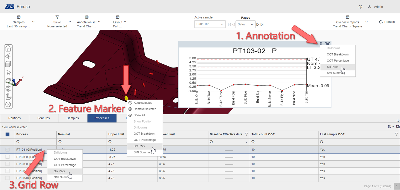 Drill Downs are single page reports (without a 3D Model) that display data for a single Process in CM4D Peruse. This type of report is used to analyze a Process visually using various graph/charts, text elements, variables, etc.