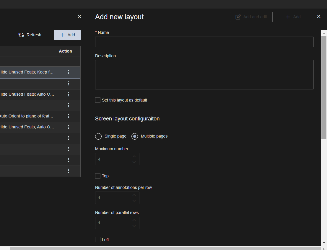 The layout screen areas only apply to Multiple page layouts. Set the area of the page where annotation may be displayed around the 3D model. Set the maximum number of annotation per row (Top) or column (Left, Right) within the layout settings.
