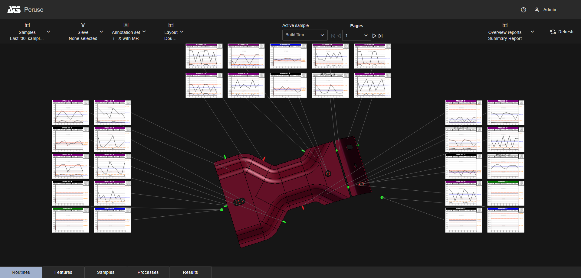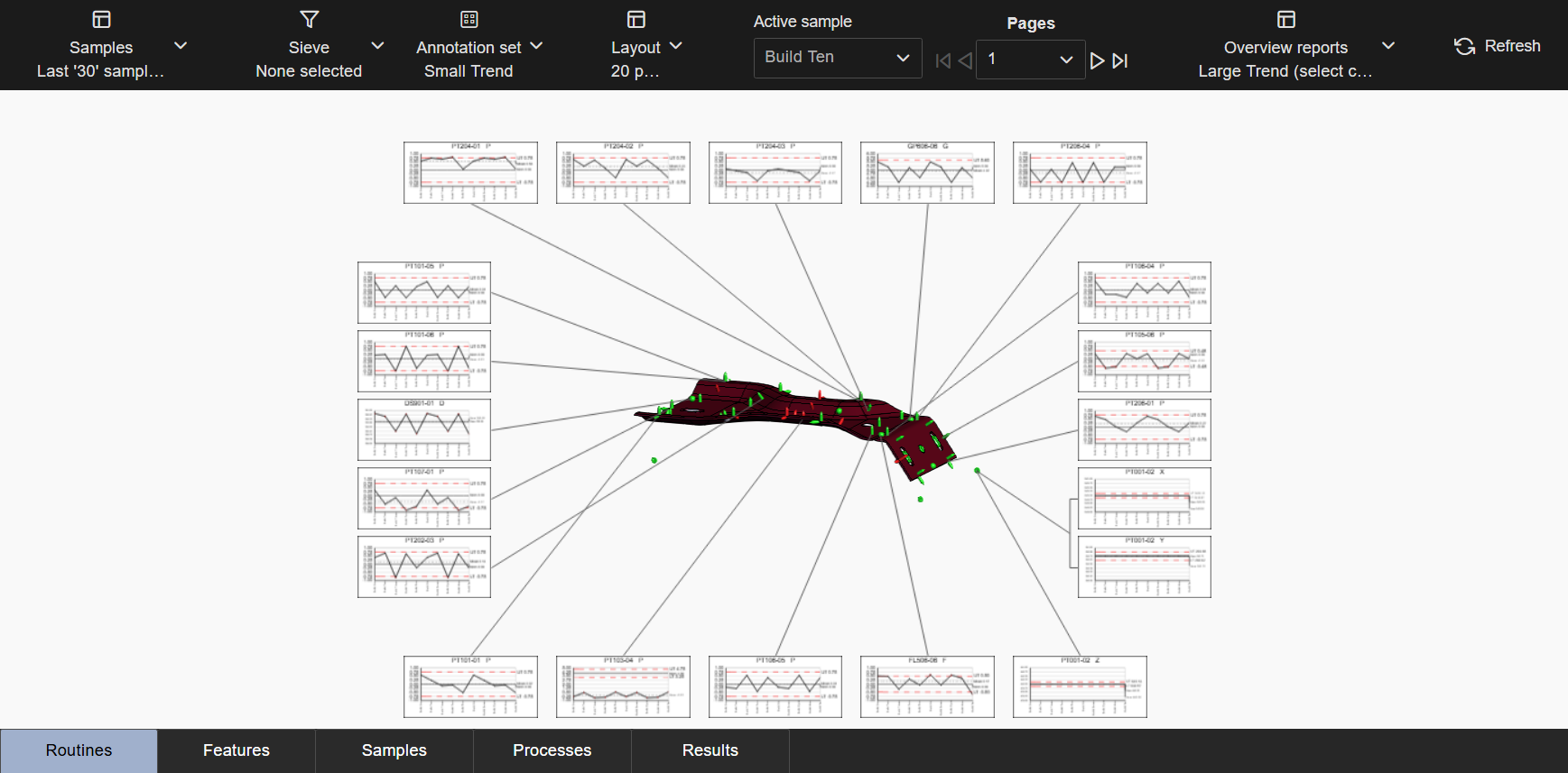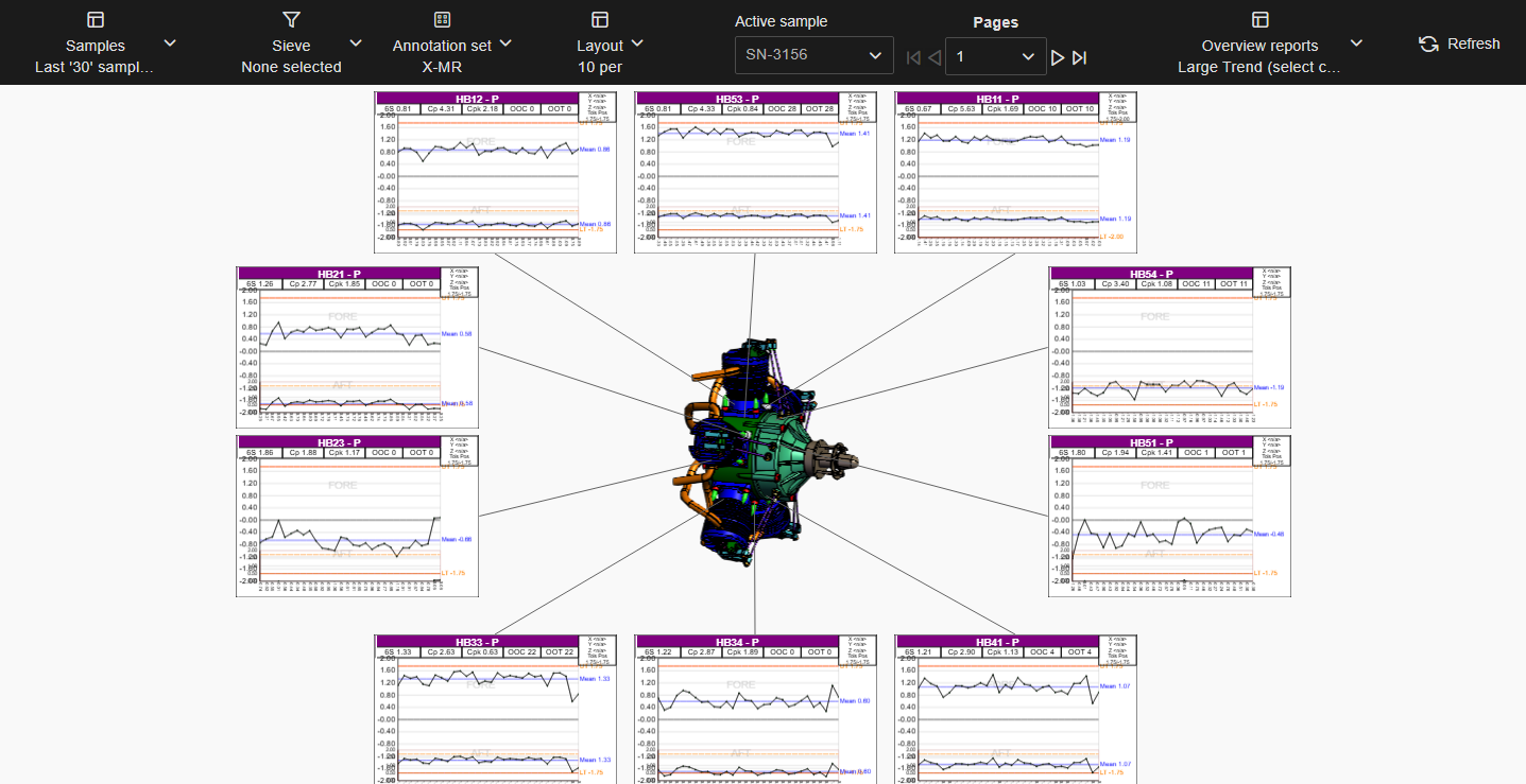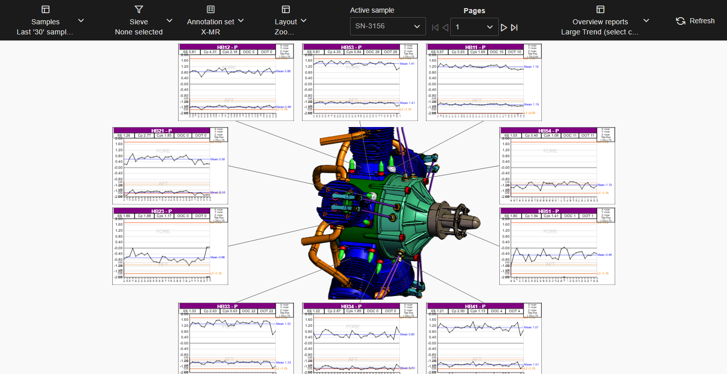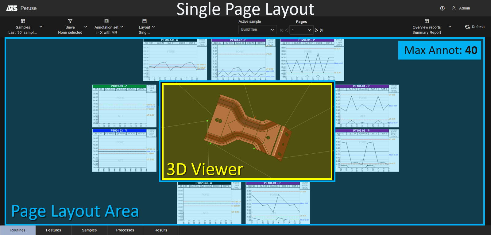 Layouts are predefined configurations of annotations (charts/graphs) connected by leader lines to feature markers on a 3D model in a central viewer area. Changes to data selection or model adjustment result in immediate updates to the layout contents, including redrawing of leader lines and annotation ordering. The type/style of the annotations in the layout is determined by the selected Annotation Set.