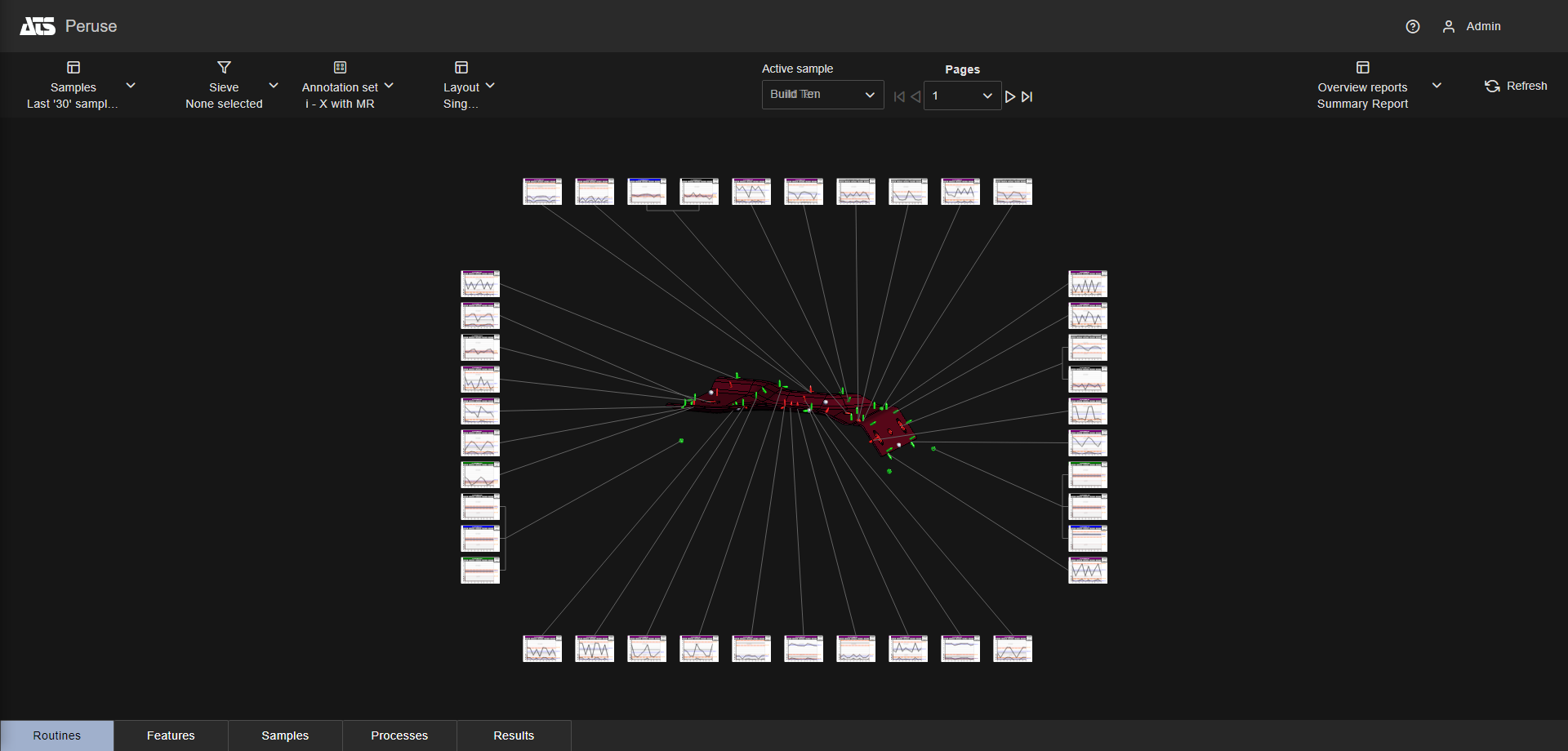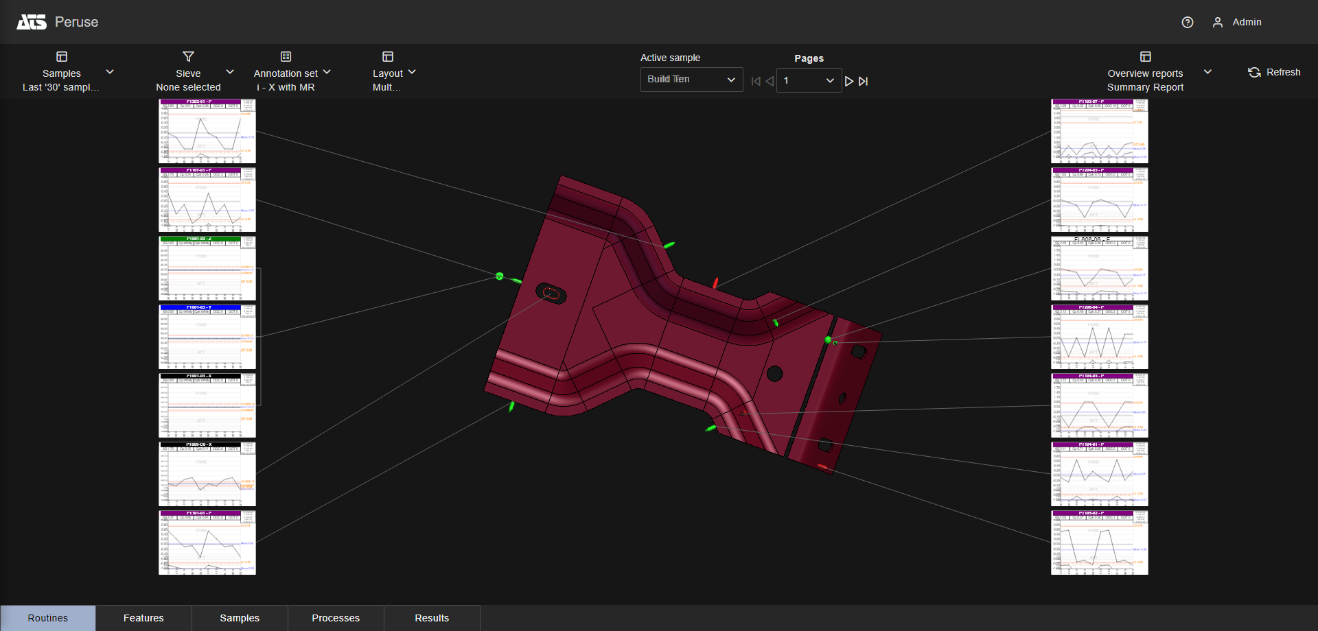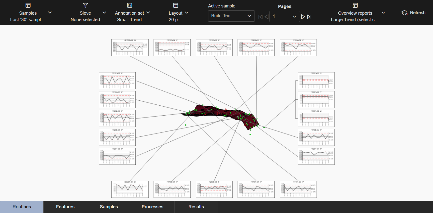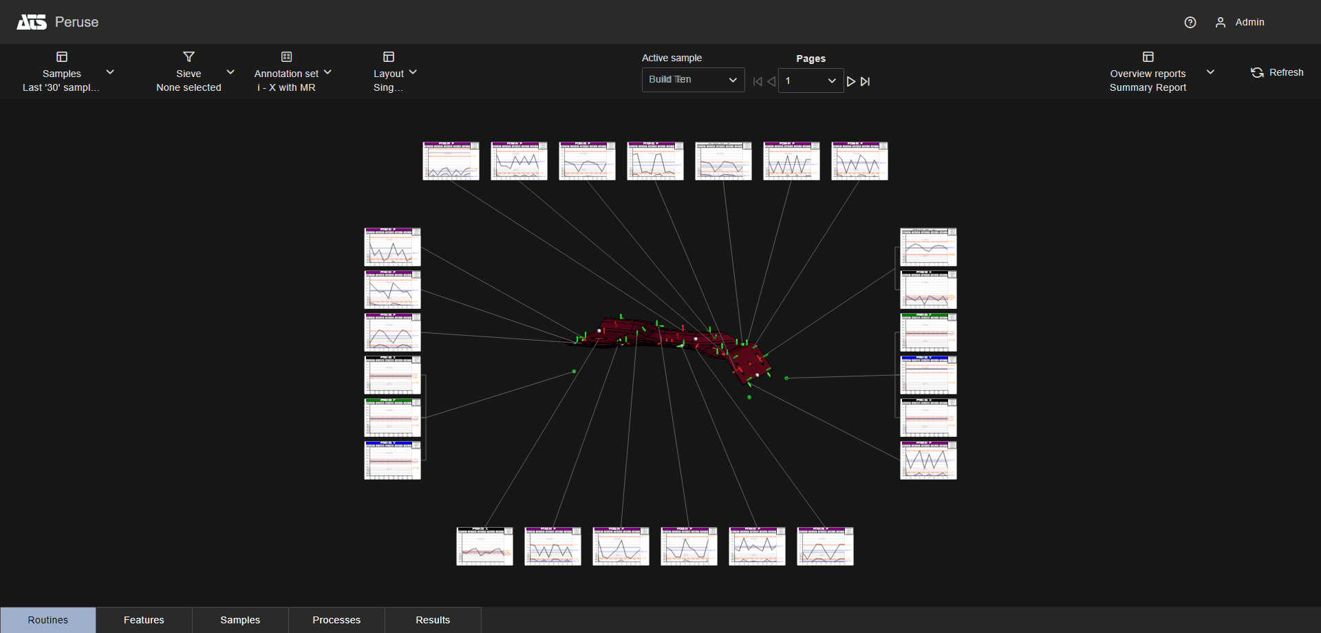 Layouts are predefined configurations of annotations (charts/graphs) connected by leader lines to feature markers on a 3D model in a central viewer area. Changes to data selection or model adjustment result in immediate updates to the layout contents, including redrawing of leader lines and annotation ordering. The type/style of the annotations in the layout is determined by the selected Annotation Set.