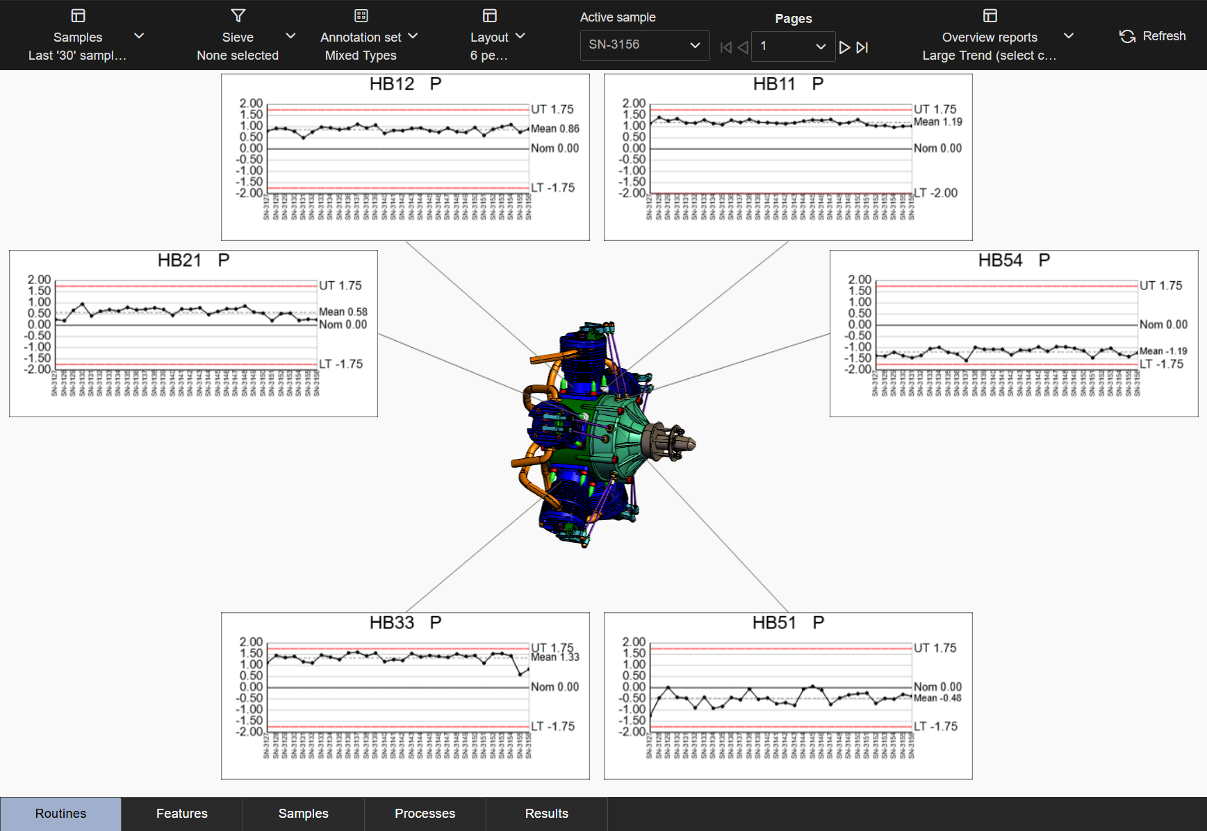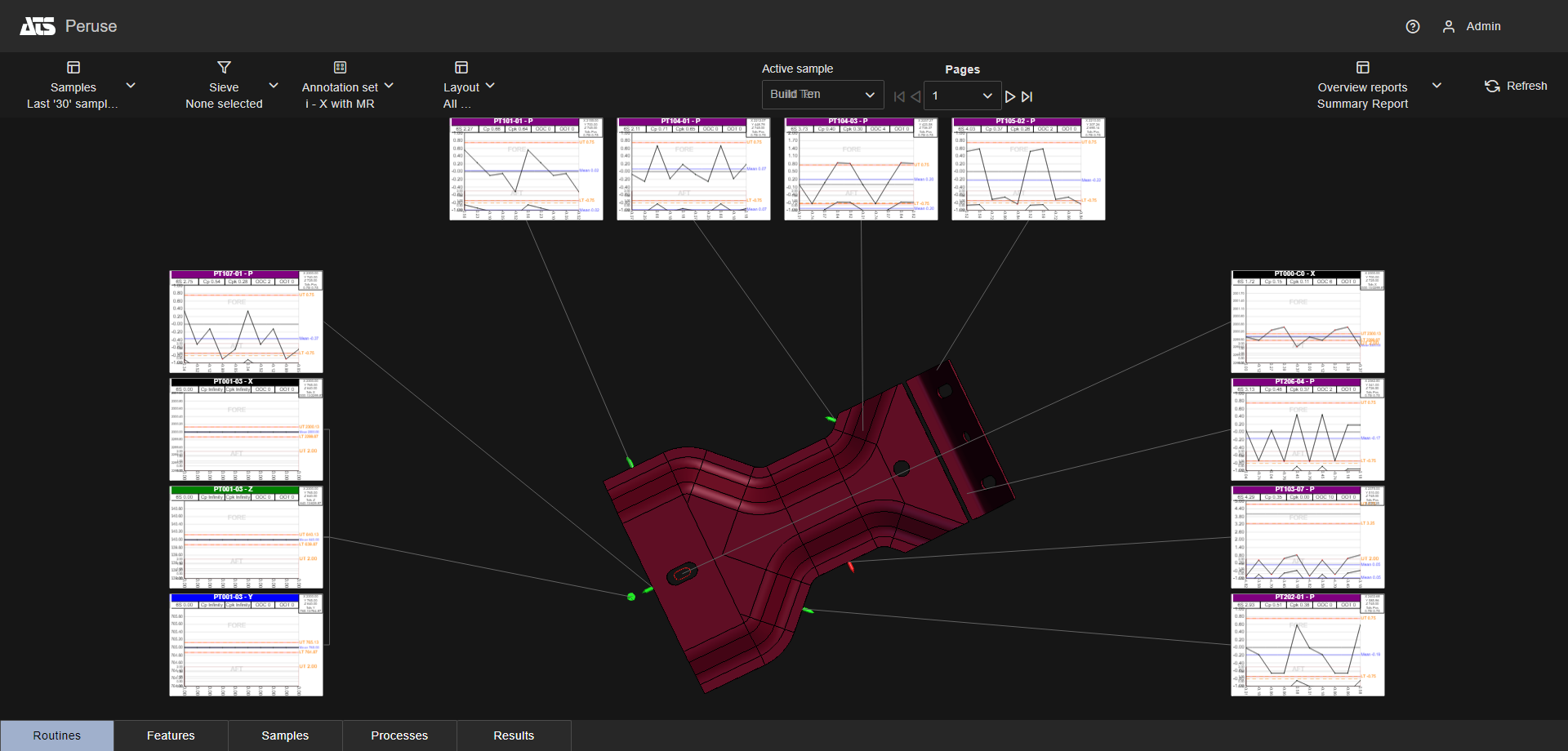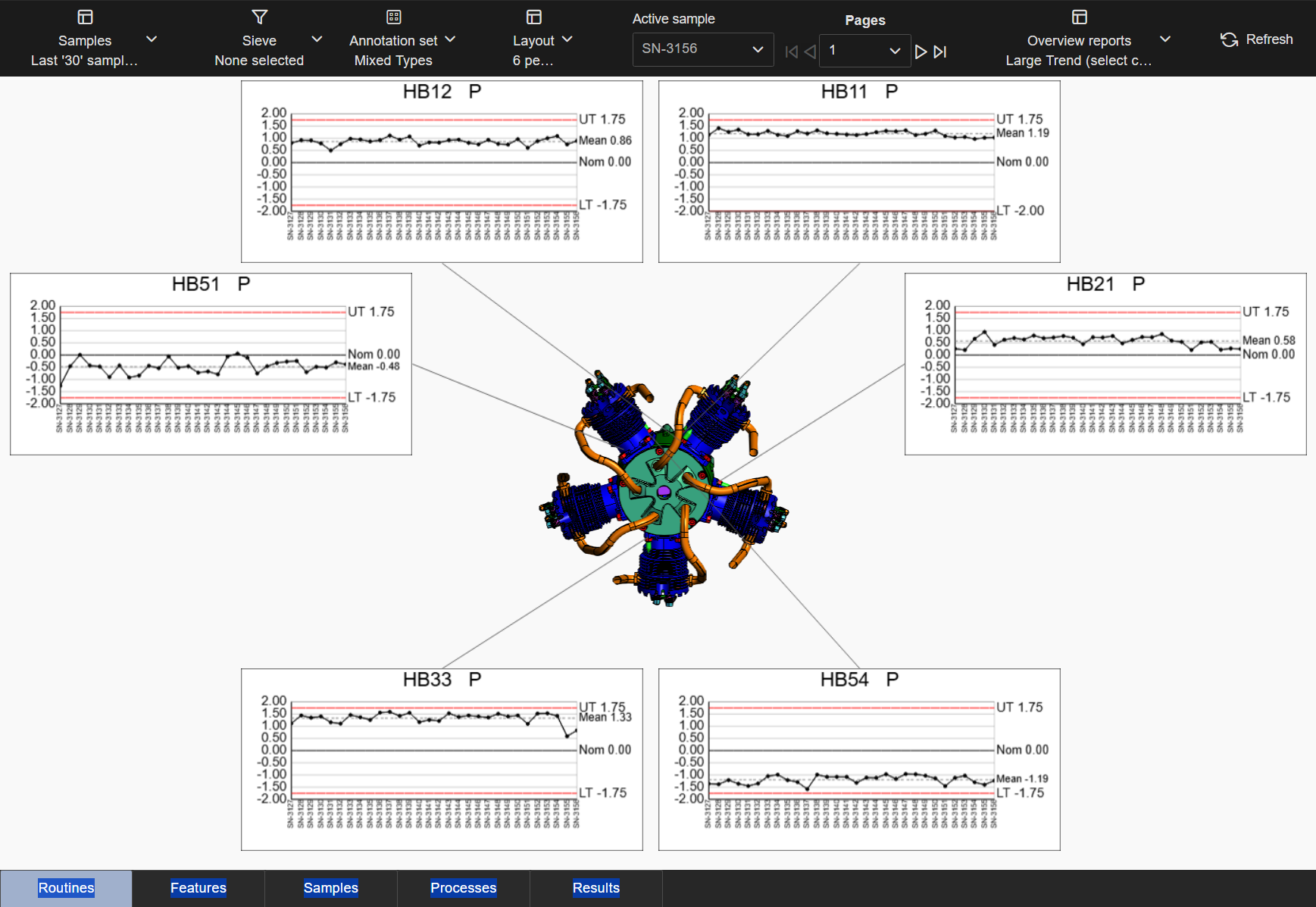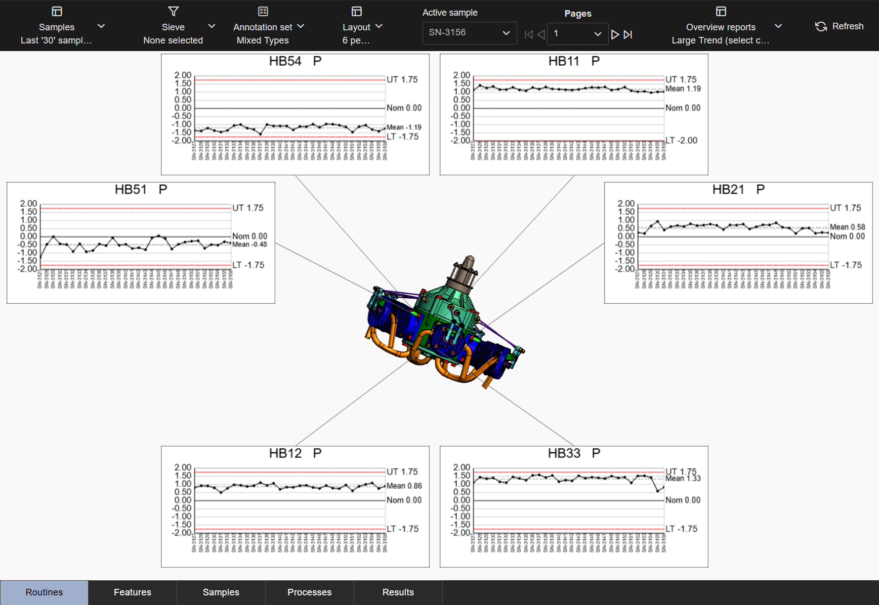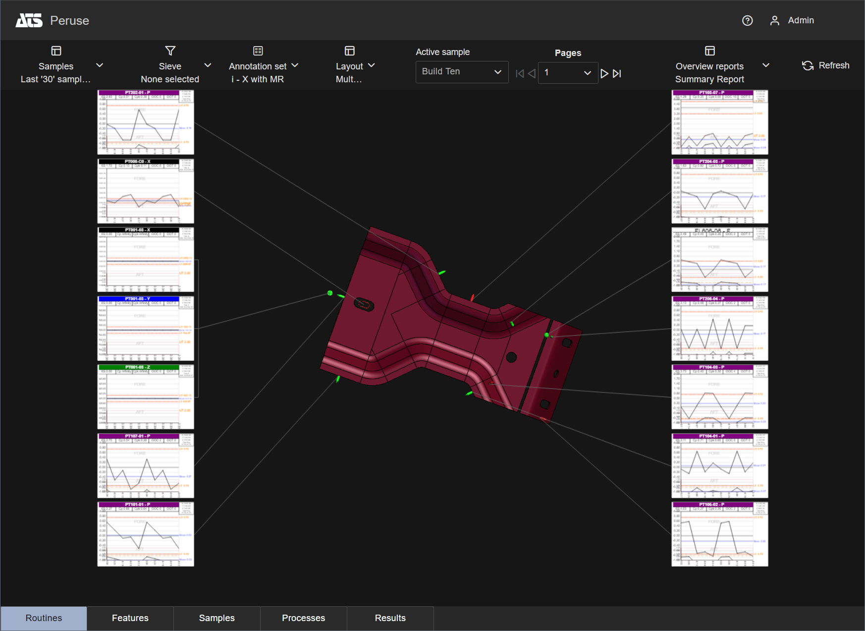 Layouts are predefined configurations of annotations (charts/graphs) connected by leader lines to feature markers on a 3D model in a central viewer area. Changes to data selection or model adjustment result in immediate updates to the layout contents, including redrawing of leader lines and annotation ordering. The type/style of the annotations in the layout is determined by the selected Annotation Set.