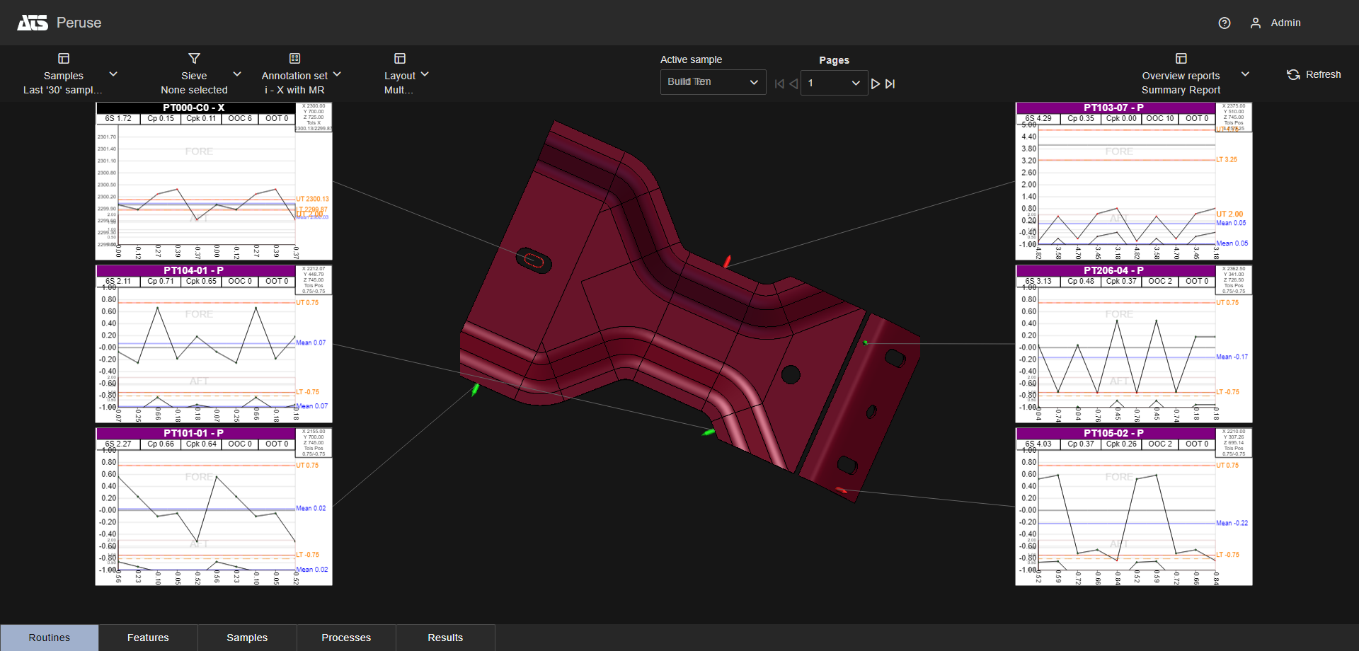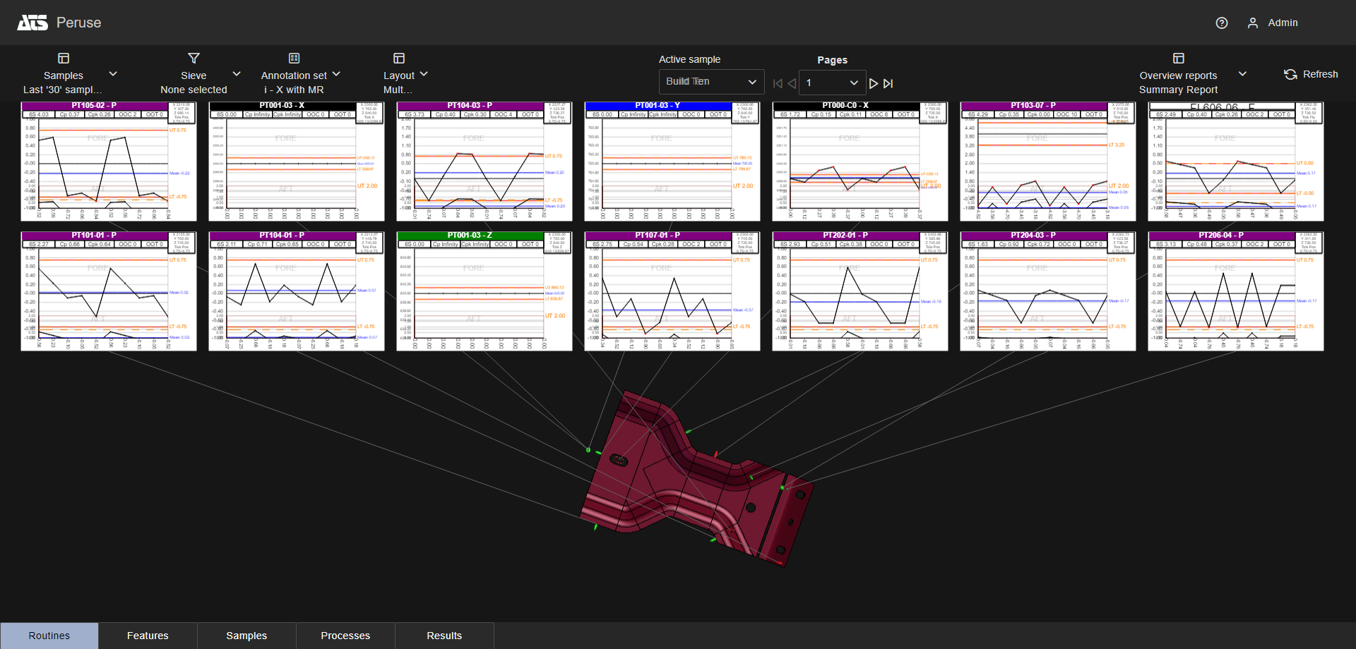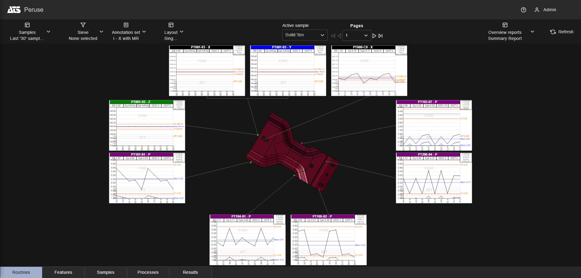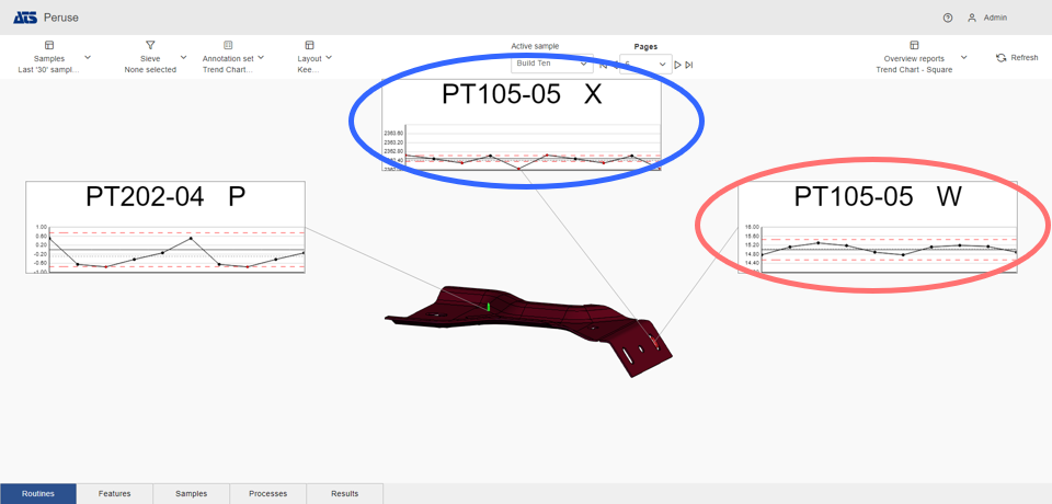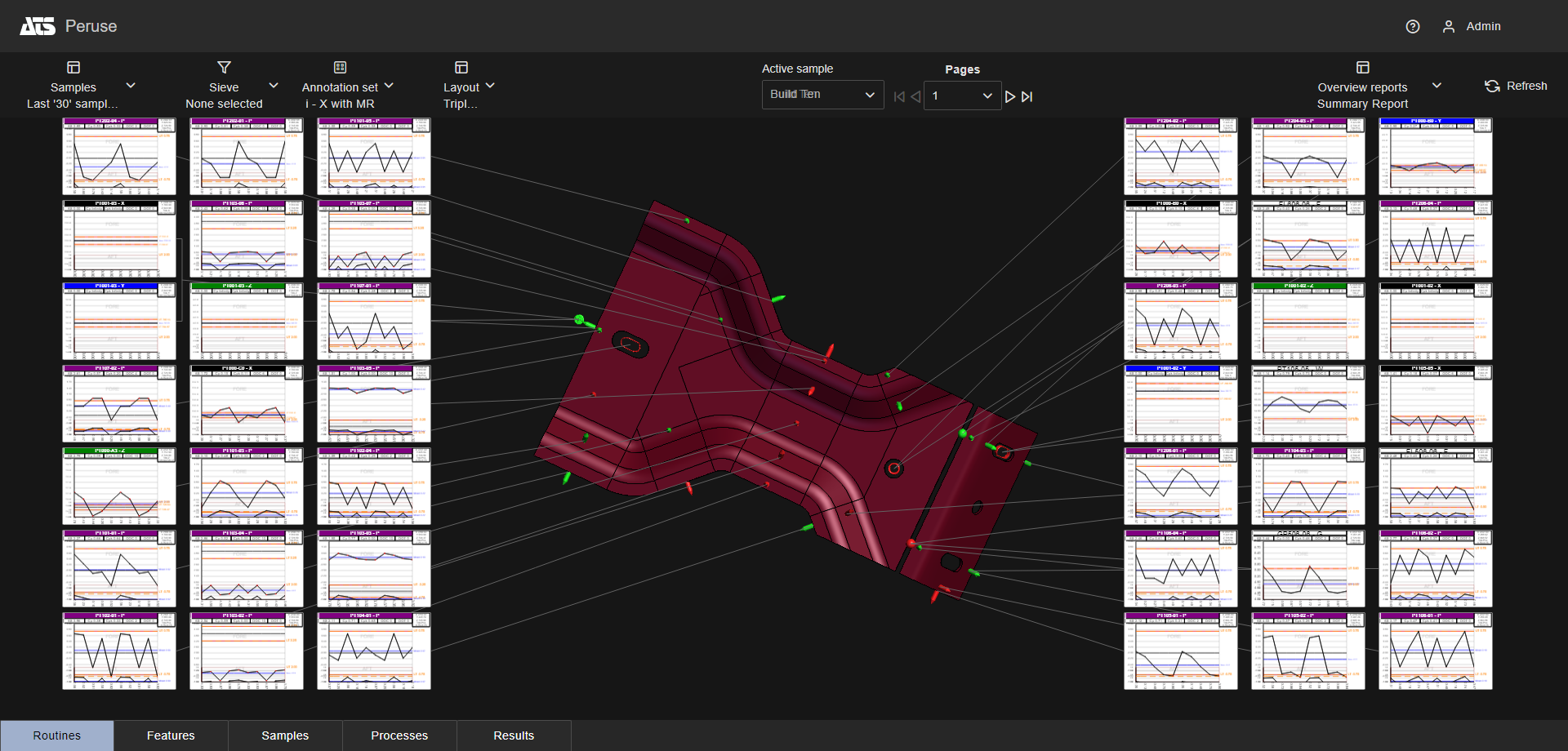 Layouts are predefined configurations of annotations (charts/graphs) connected by leader lines to feature markers on a 3D model in a central viewer area. Changes to data selection or model adjustment result in immediate updates to the layout contents, including redrawing of leader lines and annotation ordering. The type/style of the annotations in the layout is determined by the selected Annotation Set.