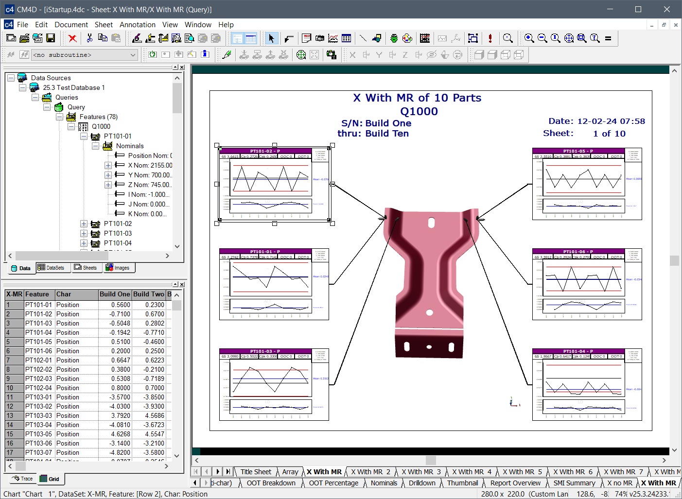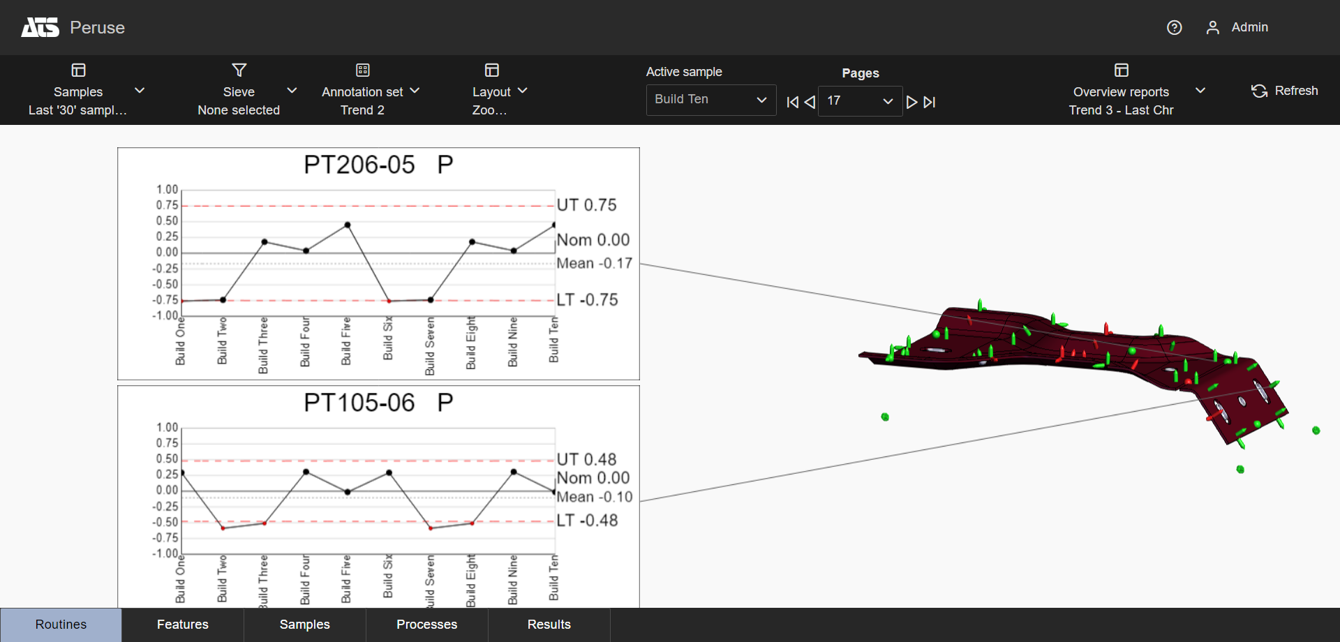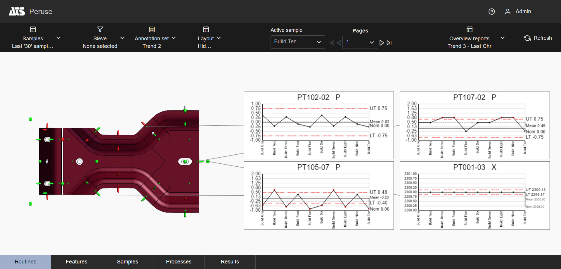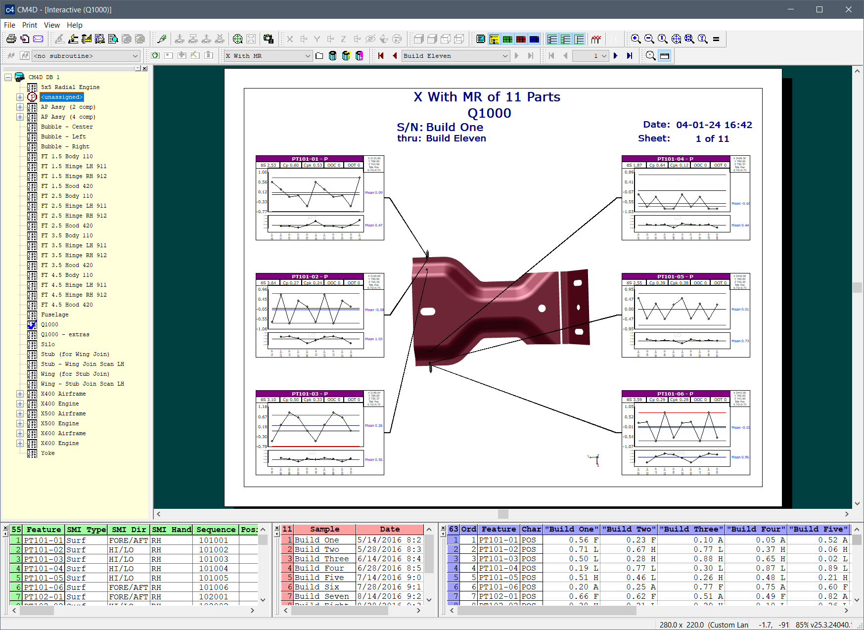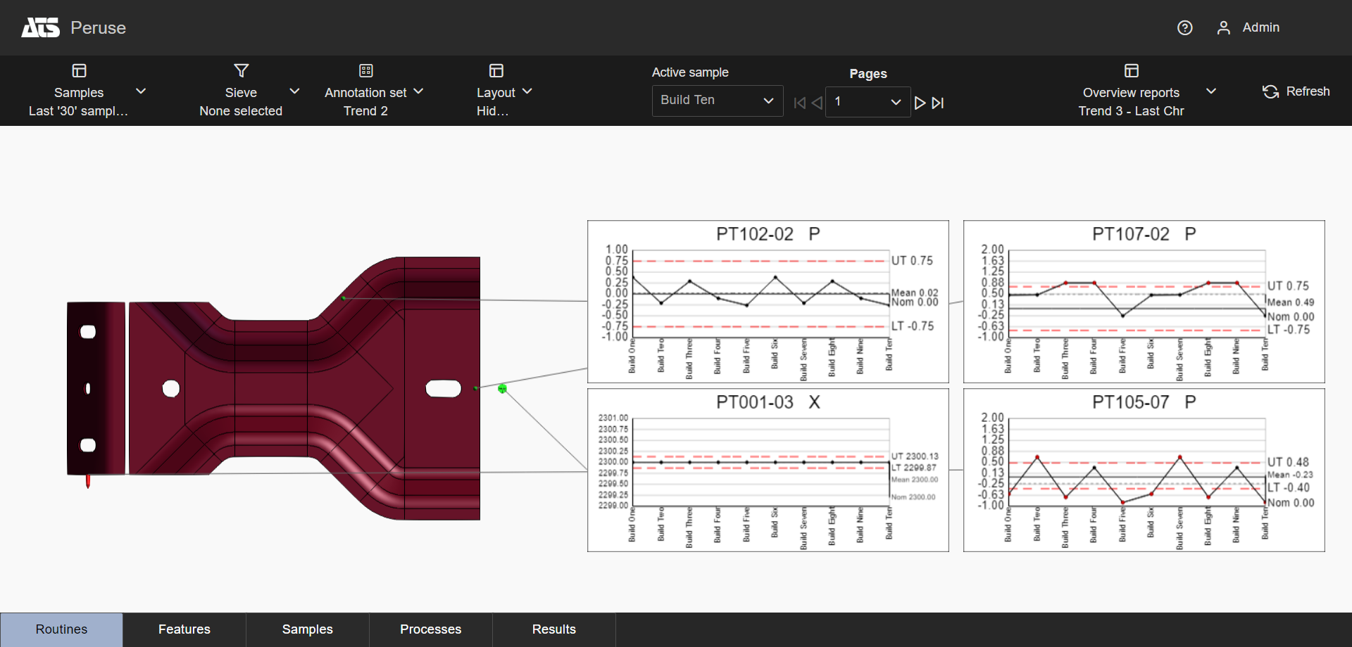 Layouts are predefined configurations of annotations (charts/graphs) connected by leader lines to feature markers on a 3D model in a central viewer area. Changes to data selection or model adjustment result in immediate updates to the layout contents, including redrawing of leader lines and annotation ordering. The type/style of the annotations in the layout is determined by the selected Annotation Set.