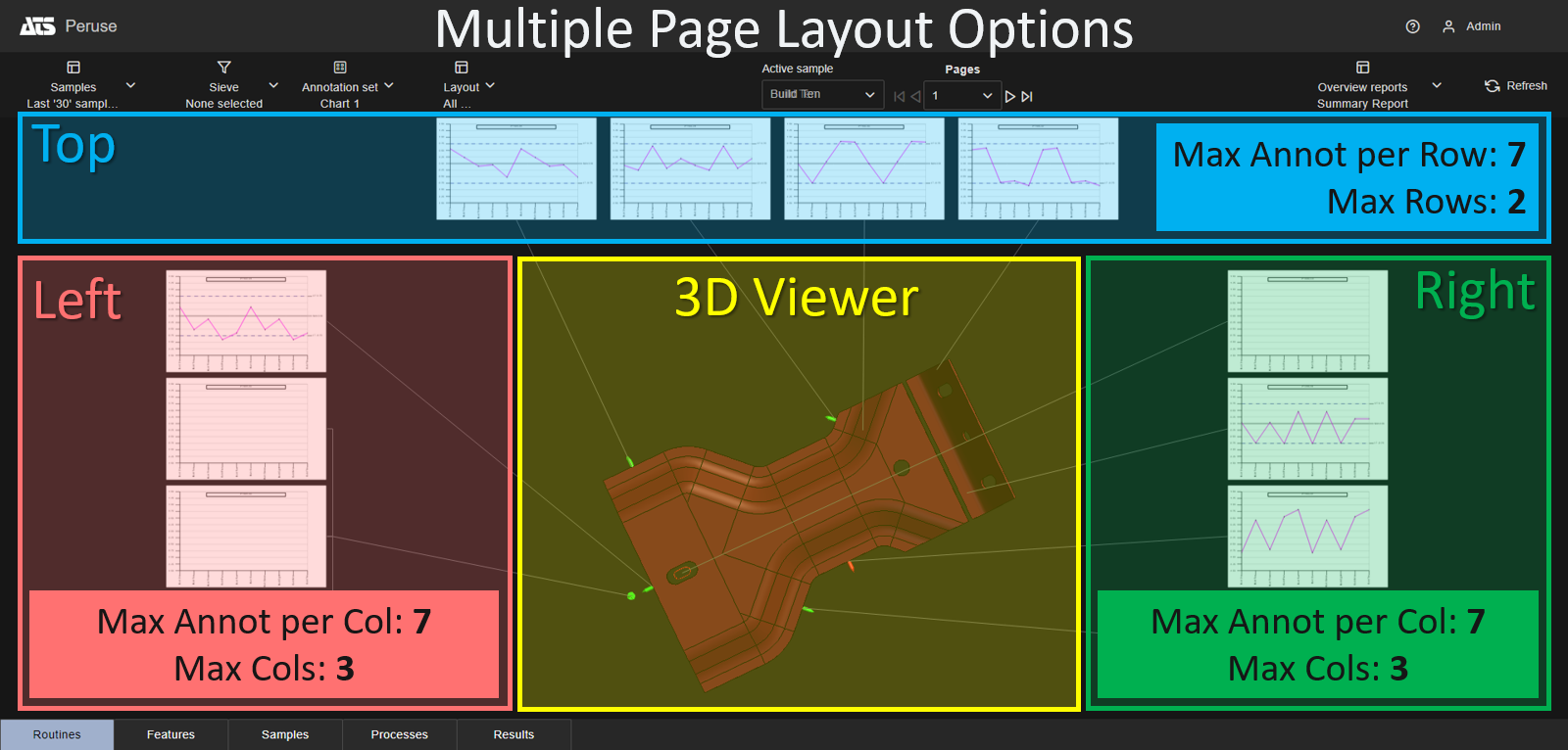 Layouts are configured by defining the placement and number of annotations on each side of the 3D viewer, along with some options related to orienting the 3D model to best display feature markers for the loaded annotations.
