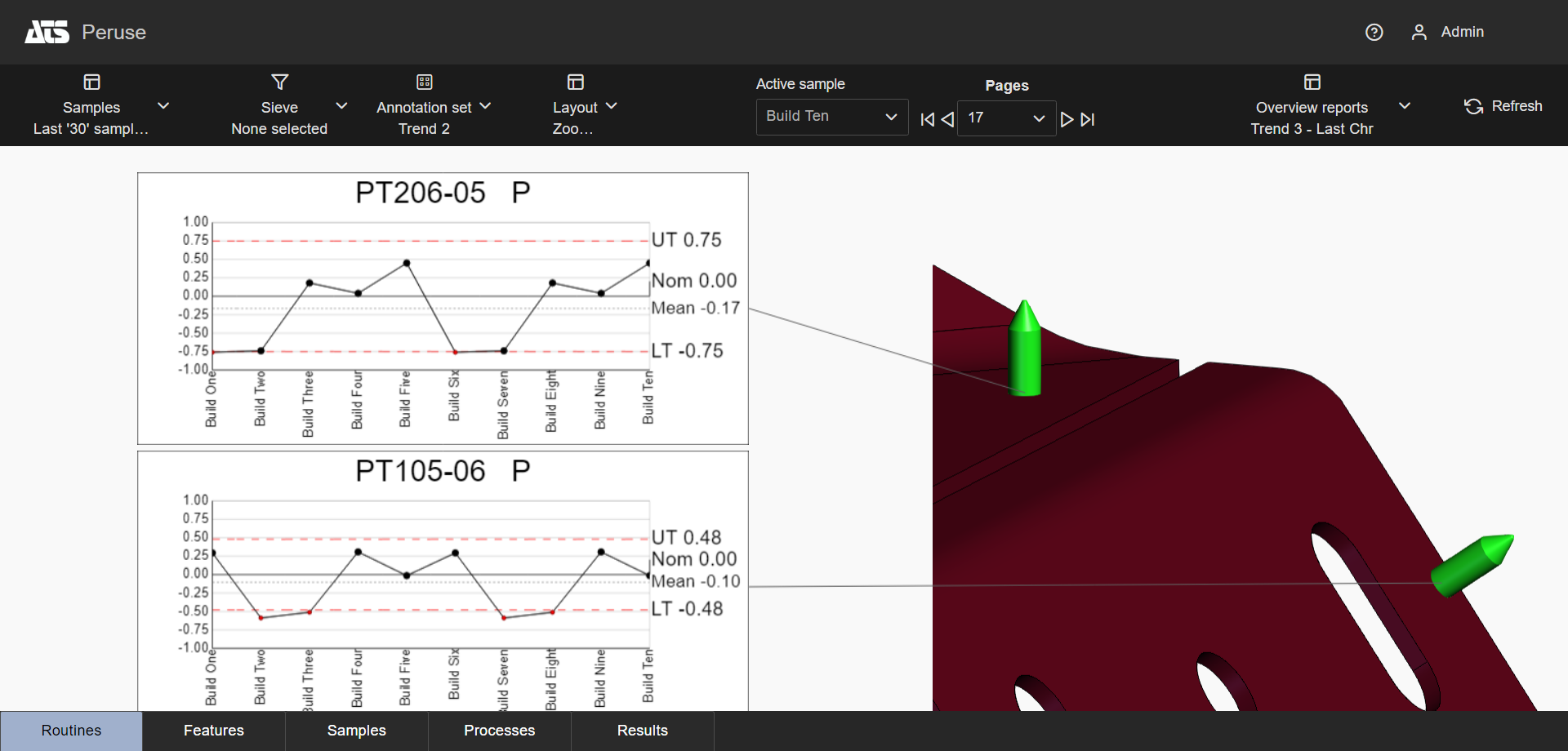 The calculated zoom changes based on the feature markers displayed on the 3D model. Switching to a different page, choosing a Sieve, using Cutting Planes or keeping/removing Feature Markers effects the zoom of the model in the view area. This allows users to always have the best view of the feature markers without requiring manual adjustment of the model on each page of the layout. If you prefer a closer zoom to the relevant features, consider adding the Hide Unused Features option to eliminate feature markers without an annotation on the current page.