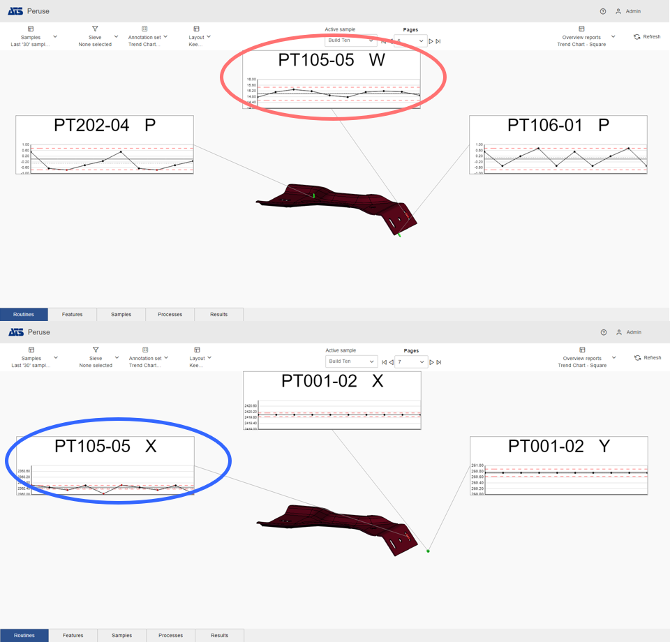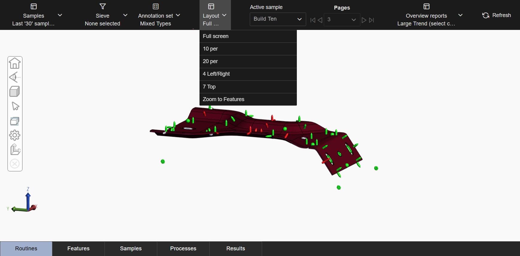 The calculated orientation changes based on what is currently displayed on the page. Switching to a different page, choosing a Sieve, using Cutting Planes or selecting Feature Markers effects the orientation of the model in the view area. This allows users to always have the best view of the feature markers without requiring manual adjustment of the model on each page of the layout.