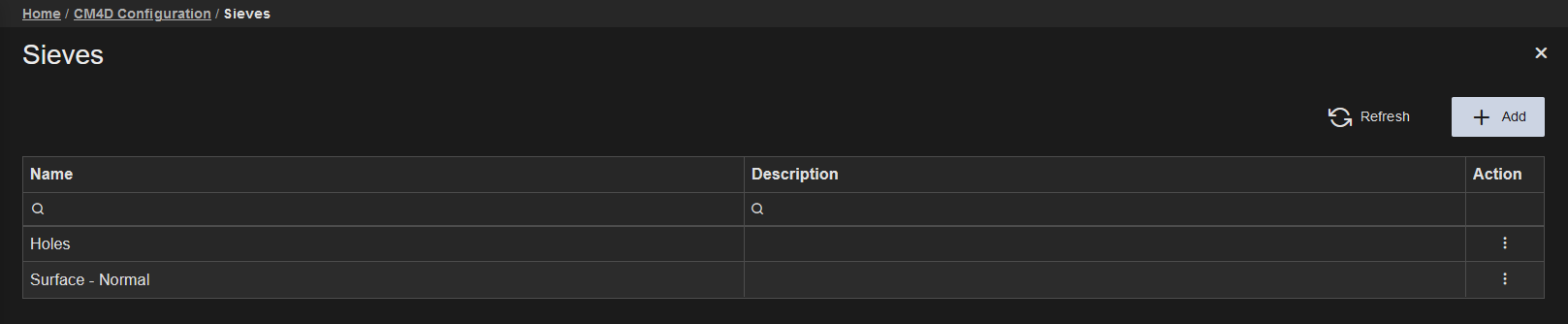 New Sieves can be created by clicking Add in the top right of the Sieves card. The Sieve Properties blade is opened automatically. To exit the add new sieve blade without saving, close the property blade.
