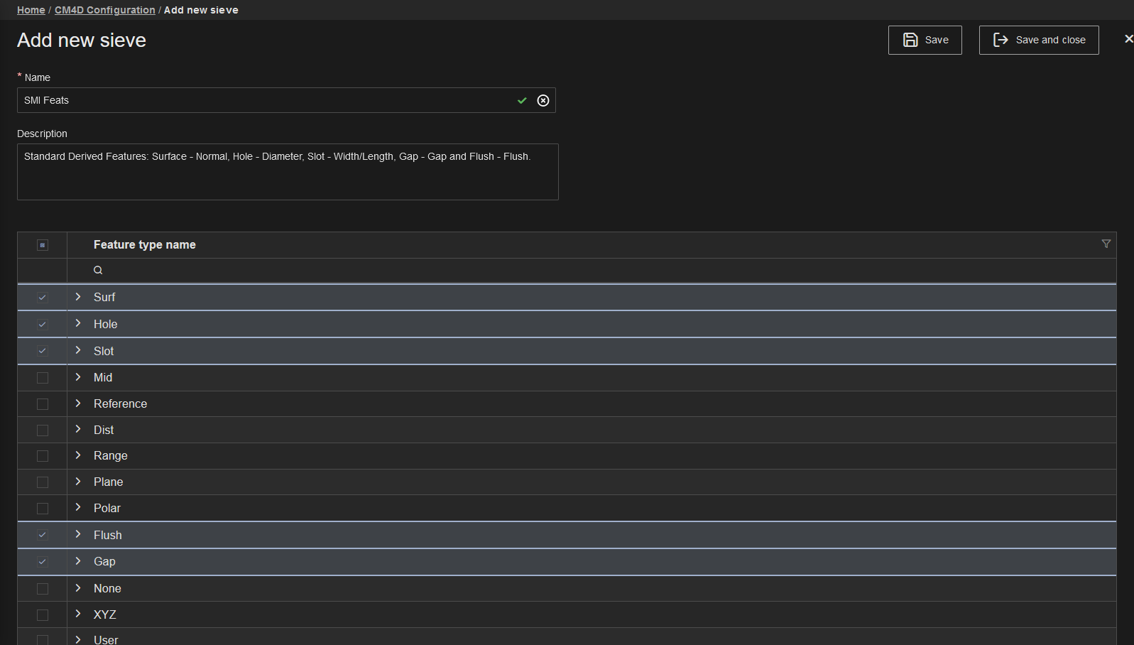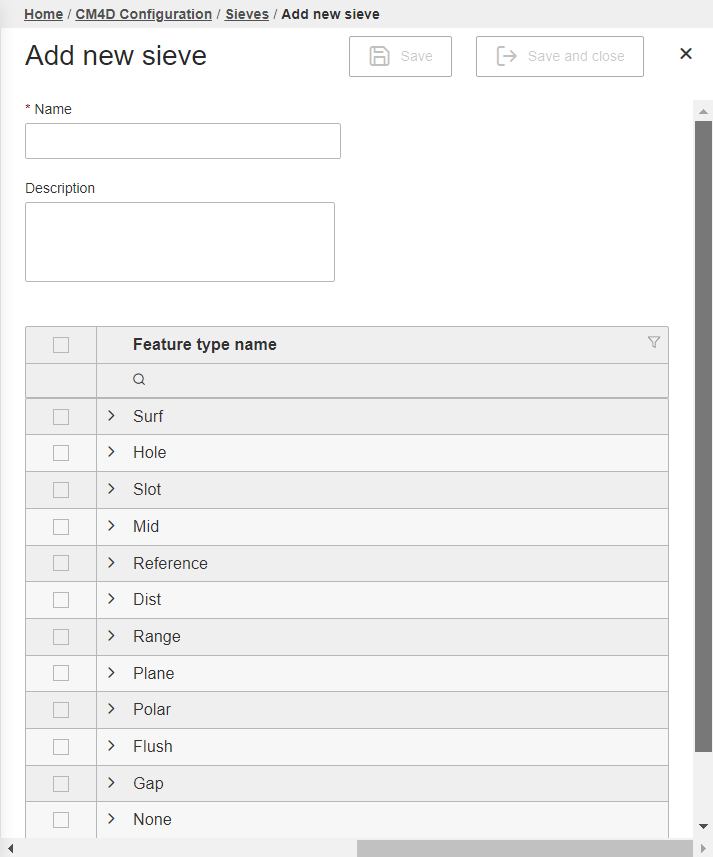 To include a Feature Type (Surface, Hole, Slot, etc.) in the Sieve, select the check box to the left of the Feature Type name. Use Search, Sort and Filter functions on the Feature Type Name column to find or narrow down your options.