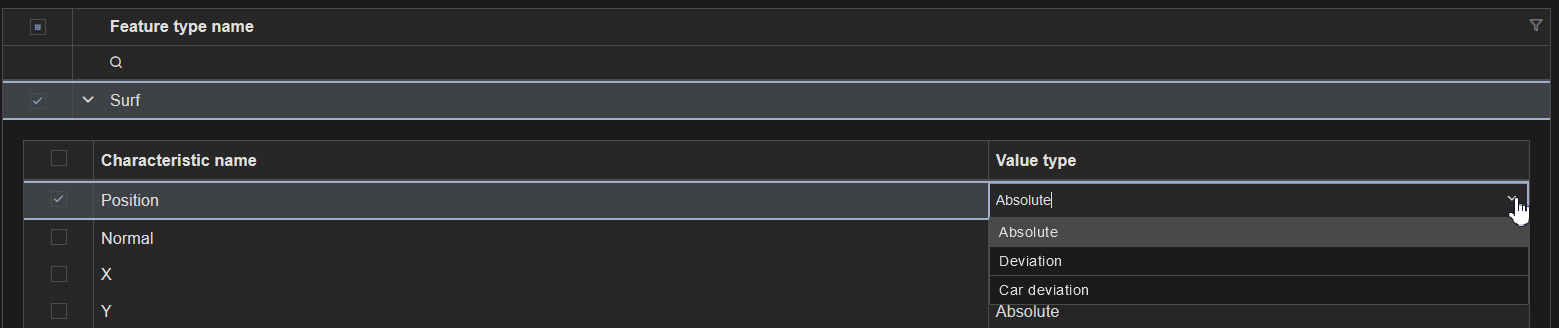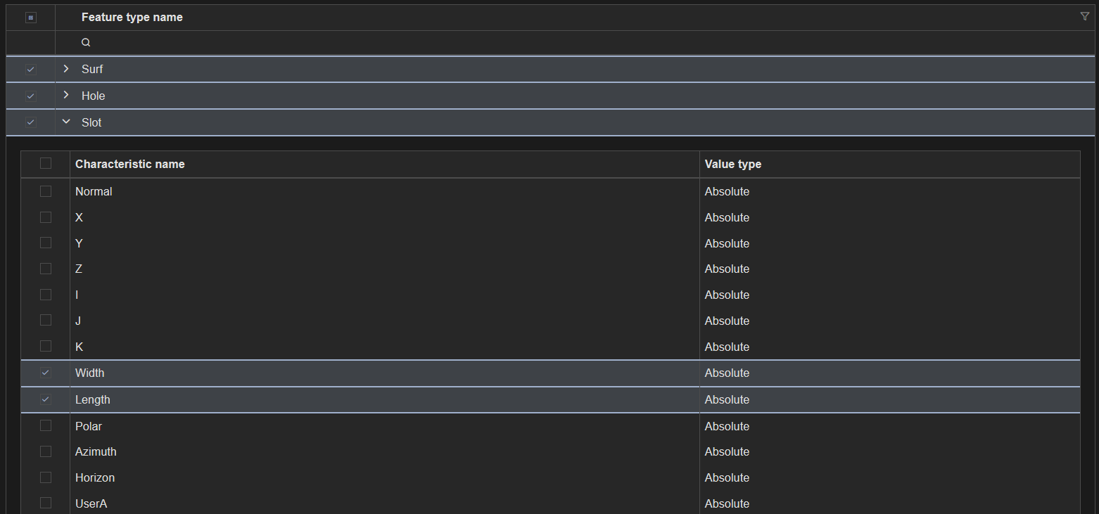 Click to expand the characteristics list for a Feature. Select the check boxes next to each Characteristic Type (Position, Diameter, etc.) you want to include. Choose the Value Type (Act, Dev, Var) in the Characteristic Value Type dropdown menu.
