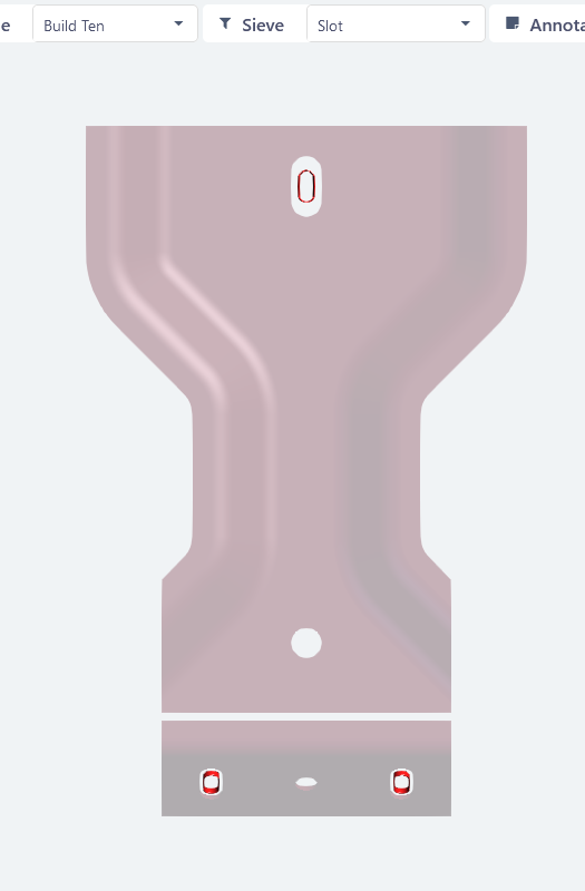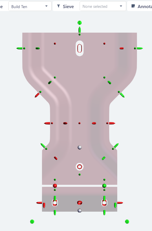 Once a sieve is selected, the information in the grids and the features displayed on the 3Dmodel is updated. The context menu for annotations on the feature markers only show the characteristics that are available for the applied sieve. |