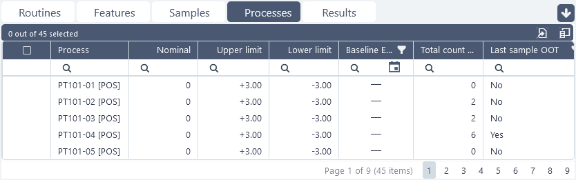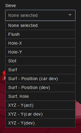 Sieves are predefined filters for selecting the feature types and characteristics to be displayed in the 3D view, grids and reports in CM4D Peruse. Sieve definitions include feature type, characteristics per feature type and characteristic deviation type (absolute or actual values, vector deviation or car deviation). If no sieve is selected, all available processes are loaded.