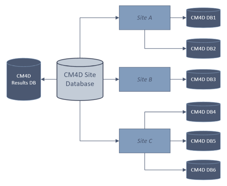 The overall organization and distribution of data for CM4D is quite flexible. You could possibly have only one Managed DataSource and one Site, multiple Managed Datasources in a single Site or you could have many Sites which have many Managed Datasources. Each Site Database maintains a single Results Database.