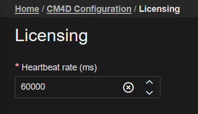 | Heartbeat Rate | The frequency at which the CM4D application interacts with the licensing server to check the current license status. The value represents milliseconds. A value is required in this field; defaults to 60000ms (1 minute). |