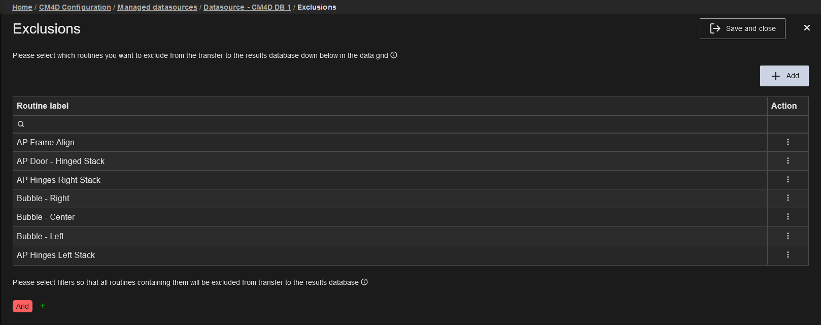 The Routine Exclusions blade allows to you to generate Results data for the Managed DataSource while selecting individual Routines be excluded from the generated results. The Exclusions grid displays all Routines that are ignored when CM4D generates Results.