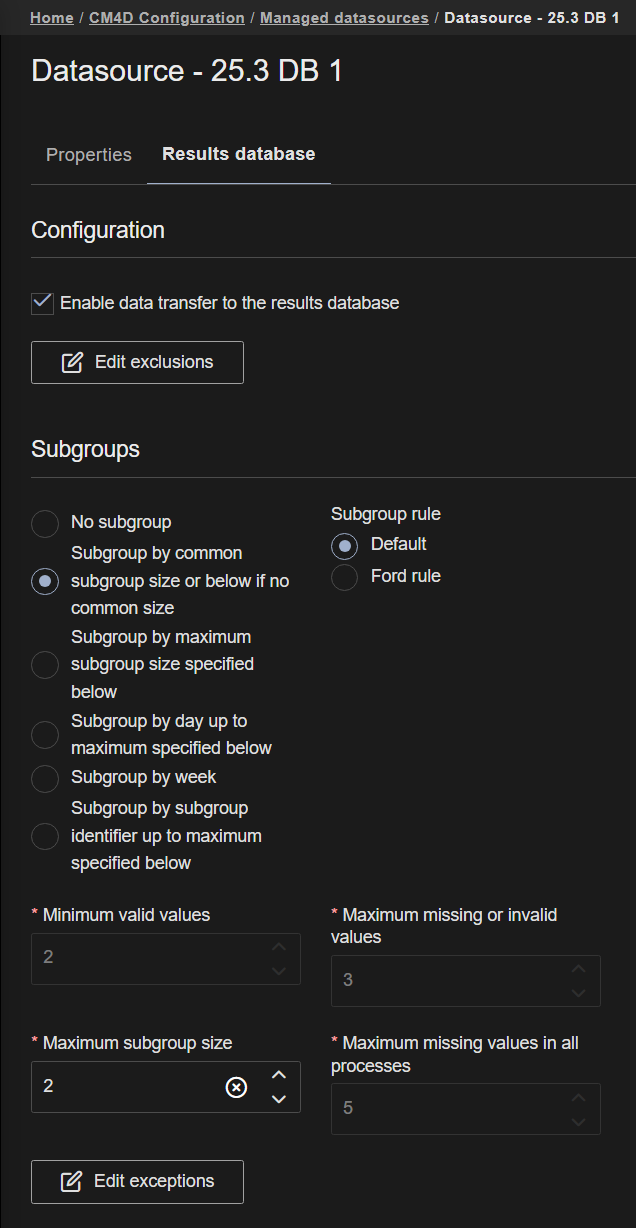 The Results Database tab contains settings related to how the Managed Datasource interacts with the Results Database, including excluding specific Routines and setting the Subgroups (default for the database or specific per Routine).