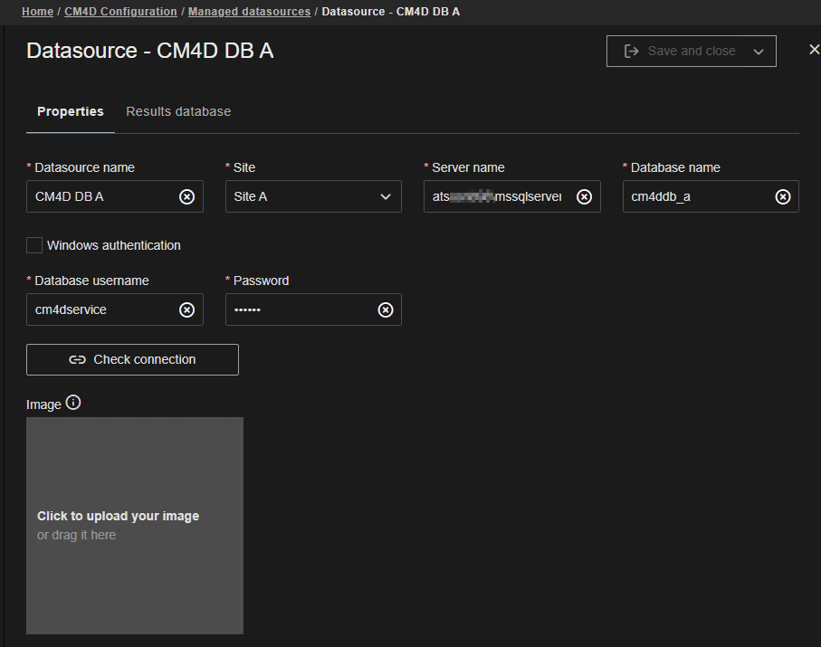 The Properties tab contains the connection details for the CM4D database. Modify properties as needed, check the connection and save the changes.