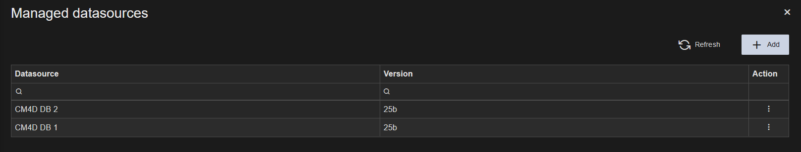 Managed Datasources created in Site Manger (desktop CM4D application) appear here on Refresh, and Datasources created here in the CM4D Config plug will appear in Site Manager the next time the desktop application is opened.