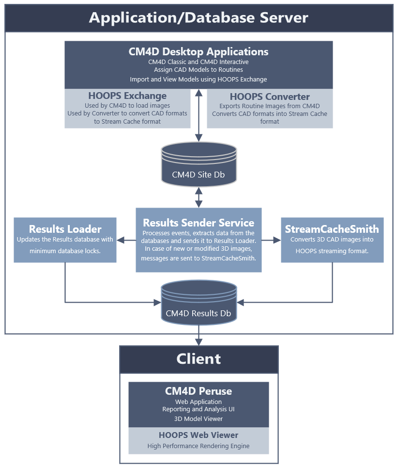 3D CAD models associated to a Routine in CM4D are converted to a stream cache format. The model information is stored in the database and the model stream cache files are stored in a Model Directory on the HOOPS Communicator server. The models are then streamed from the HOOPS server to clients and rendered by the HOOPS Web Viewer on the client-side in CM4D Peruse. This requires the end client, the machine running CM4D Peruse in a web browser, to do the actual rendering the 3D model when it is loaded into the web viewer in CM4D Peruse.