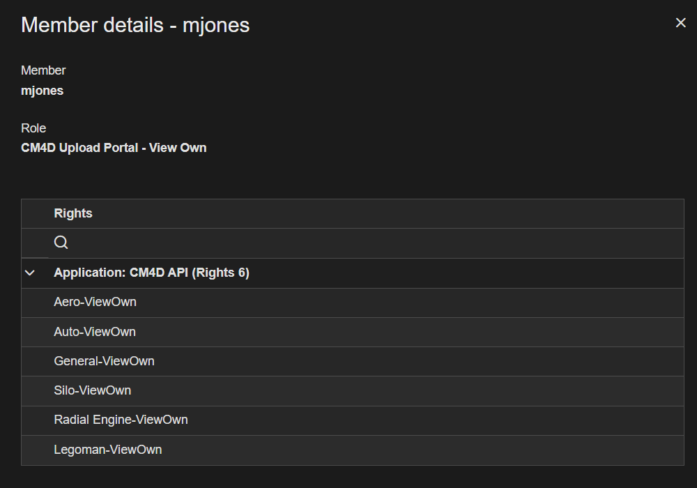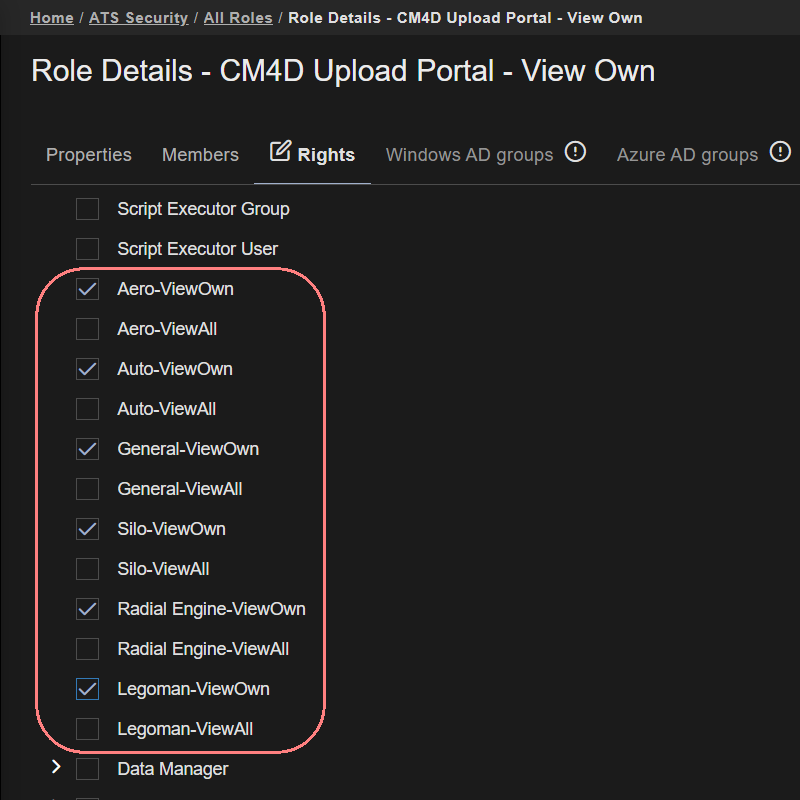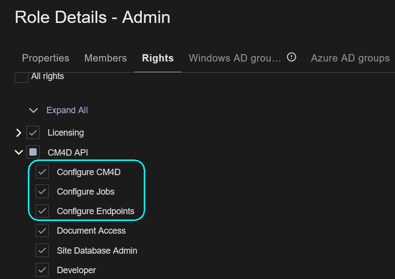 Each DataSmith Job has two corresponding security Rights that must be granted to a Role for users to be able to see the project in their Upload Portal. For example, a Job/Project with the label 'Silo' has the associated rights labelled 'Silo-ViewOwn' and 'Silo-ViewAll'. Complete the following steps for each Role that requires Upload Portal Project rights: Click on a role in the Roles grid card to open its properties. In the role properties, click on the Rights tab. Expand the CM4D API node. Check boxes for the projects you want to add for the role, either ViewOwn or ViewAll for each project. Click Save. |