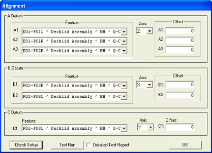 The datums used to create the A Datum, B Datum, and C Datum can be selected from the Feature lists. The axis of the datums, X, Y or Z, is selected from the Axis list. Offsets can be added to each of the datums. The Errors dialog will list any errors CM4D finds with your alignment. Clicking Check Setup will check for common setup errors in alignments. Clicking Test Run will perform the alignment and report any errors. Clicking OK closes the alignment dialog.