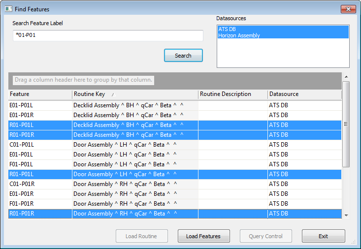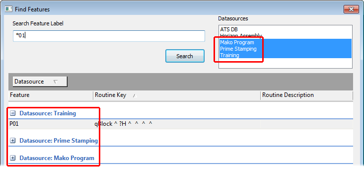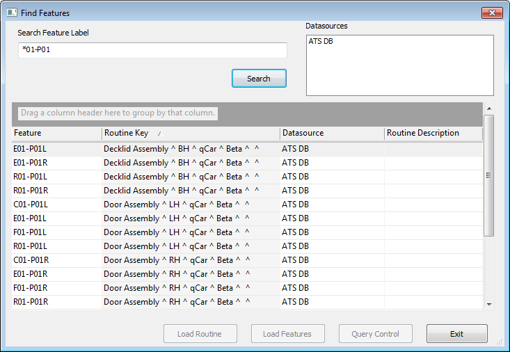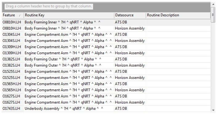 - Columns - The available columns (Feature, Routine Key, DataSource, and Routine Description) can be used to sort and group the results of a search.