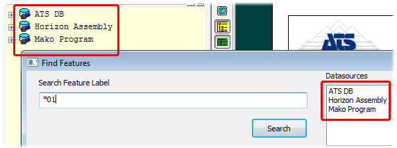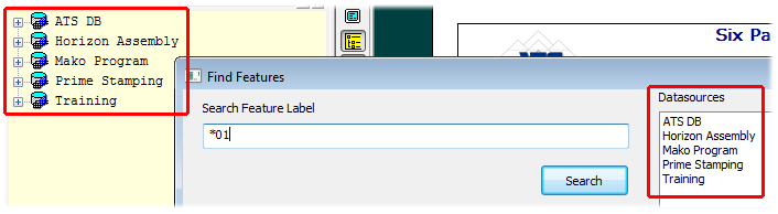 DataSources that are searched will depend on your startup document. All DataSources that appear in the yellow Nav Tree will be available for searching within the Find Features dialog. If none of the Datasources are highlighted, the search will be performed on all of the Datasources.