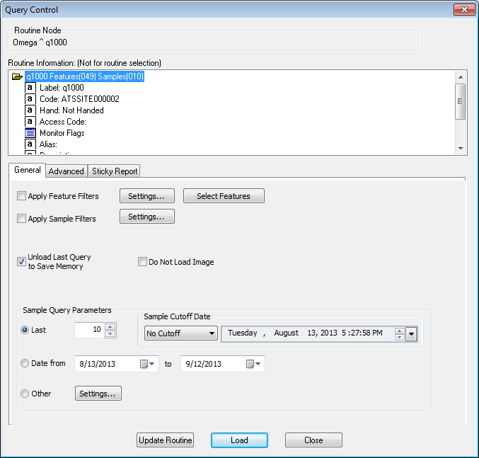 The Query Control contains options for loading sample data into the report for the selected routine. Within the Query Control dialog, there are options for modifying how you load the Routine from the database. To access this dialog, right-click on a Routine label in the yellow Nav Tree and select Properties.