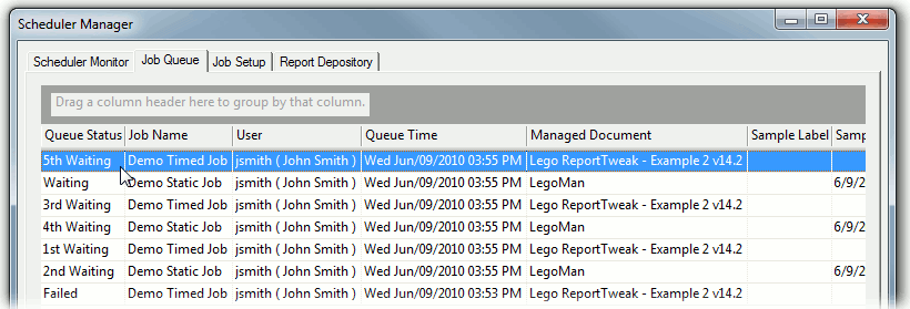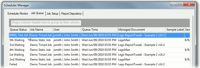 The Job Queue tab contains the status of all pending jobs and allows you to view the status of any current jobs or remove any waiting or failed jobs.