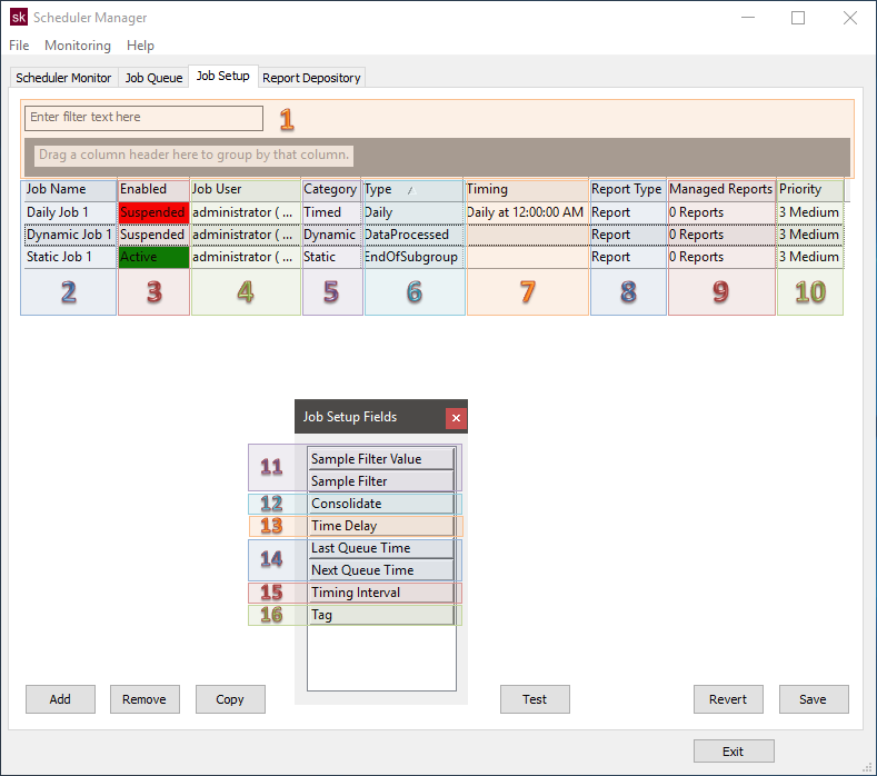 The Job Setup tab displays all of the settings for a selected job, and allows you to create, edit, or remove Scheduled jobs.