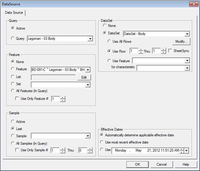 The Scheduler DataSource is defined using the same type of DataSource property tab as the Annot Properties dialog, where you can select a Query, Feature, Sample, or DataSet to serve as your DataSource.