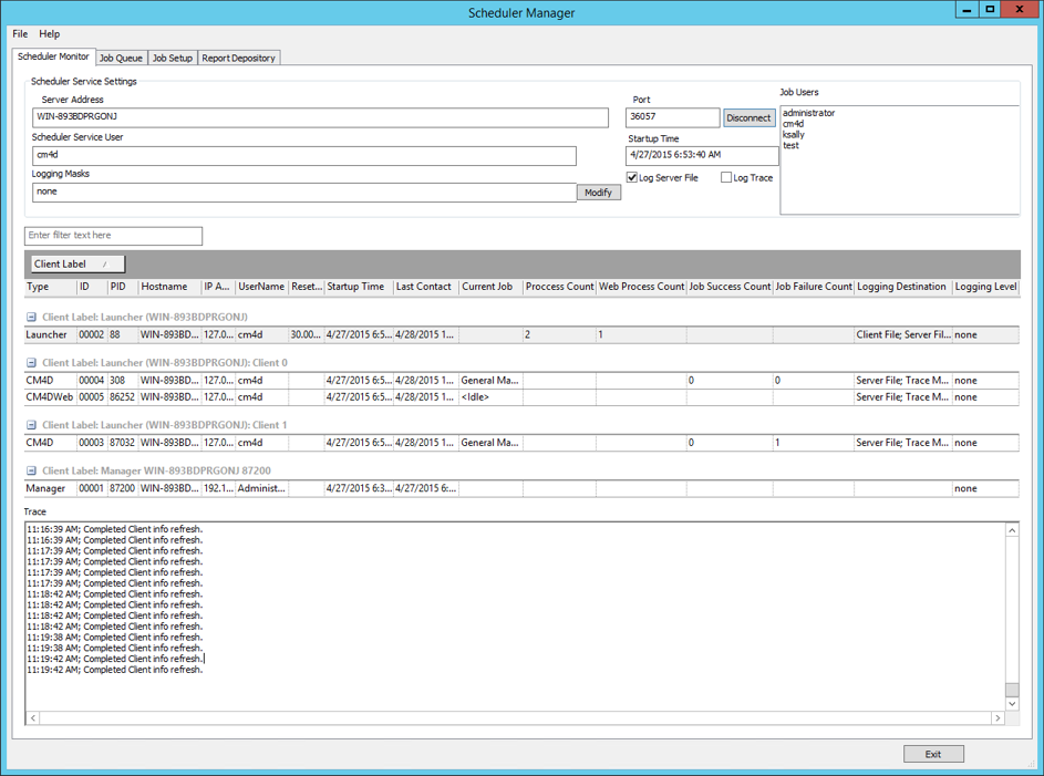 The Scheduler Monitor tab contains the connection, user, and logging information for the active connection to the Scheduler Service.