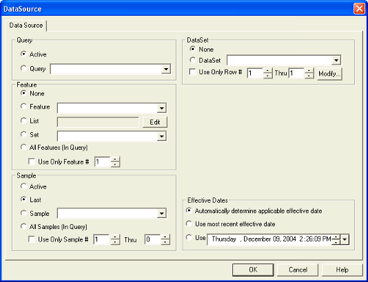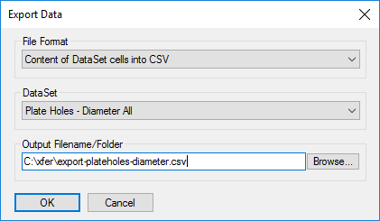 If you click inside the document region, then push F7 on the keyboard, the export Dialog will appear. Enter any desired information (i.e. ~label~, ~nom, X~, ~Dev, X~, ~nom, i~) in the text field of the dialog. You can export aliases, nominals, etc., and when you choose a DataSource you can select data to export from the specified routine, features and samples, or DataSet that is selected.