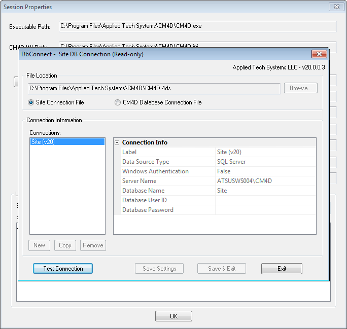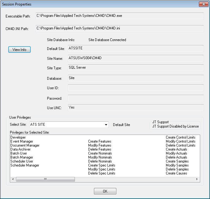 Under Site Database Info you can see whether or not you are connected to a site. If you are not connected to a site, the message "No Site Database Connected" will appear, and the Site Database Info fields will remain blank. If you are successfully connected to a site, the message "Site Database Connected" will be shown, and the fields will show information about the connected site. You may view a Read-only version of your current DB Connect information by clicking the View Info button.