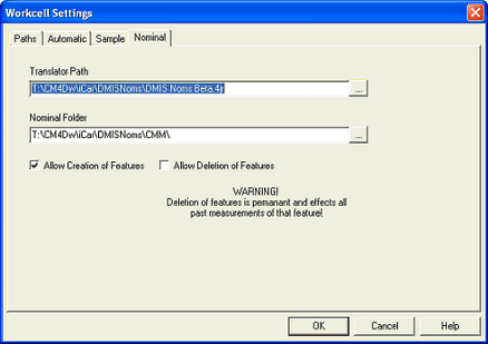 All of the settings on the Nominal tab are optional. If the fields on this tab are left blank on startup, Workcell will assume that you do not want to use nominals. If a string does exist in one of those fields, Workcell will assume that you do want to use nominals and an error will appear if the folder paths are invalid prior to running Workcell. The Translator Path should point to the location of your nominal .4jr file, and the Nominal Folder path should point to where your nominal data files live.