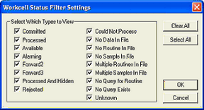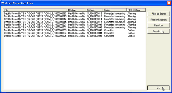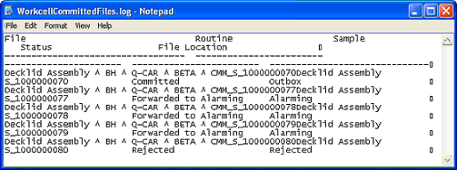 The Workcell Committed Files dialog contains a list of all of the files that have been loaded into Workcell, whether they have been committed, forwarded, or rejected. The files in the Committed Files dialog can only be viewed, filtered, cleared, or saved to a log file.