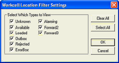 In the Status Filter Settings dialog, the first column contains a list of actions that can be taken with a file, while the second column lists the possible error conditions Workcell may report.