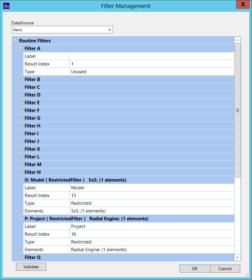 The Validate button may be used to confirm that all changes made to the filters are acceptable. Any changes that would cause conflict with another Routine/Feature/Sample filter would be invalid. This check is also done each time the OK button is selected.