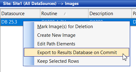 The Export to Results Database on Commit option in the context menu for an image can be used when something in a 3D image file changes (value in file), but does not change in relation to CM4D (file name or storage location). On Commit of this pending change in DataUtility the marked images are sent to the Results Export Command Queue for processing into the Results database by the StreamCacheSmith service so the image can be re-rendered with the updates.