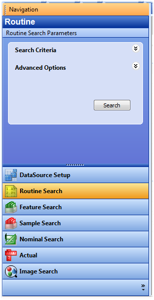 The Navigation pane contains all of DataUtility's search options. The various regions and tabs can be minimized or closed in order to maximize your workspace. Use the expand arrows (