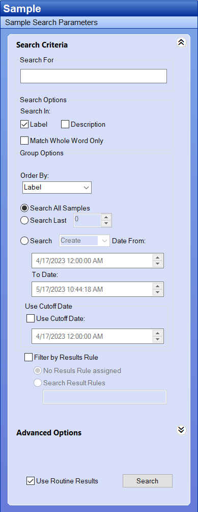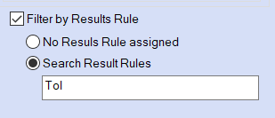 This option allows you to find Samples based on either a specific Results Rule label or by Samples with no Results Rule assigned. To search for Samples with a specific rule assigned, select Search Result Rules type a partial or complete Results Rule label in the field.