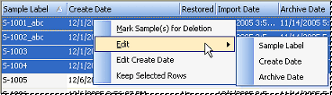 Sample characteristics can also be modified using the multiple select function. When more than one sample is selected, right click on a column of the highlighted samples and choose one of the Edit options available in the context menu.