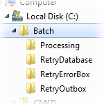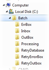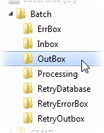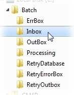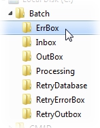 The Inbox, Outbox, and Errorbox can be set to locations other than the default relative directory. If this is the case, then the Batch Folder would contain only the Processing folder and the three Retry folders (the remaining three folders could be located on network drives), as shown in the images below:
