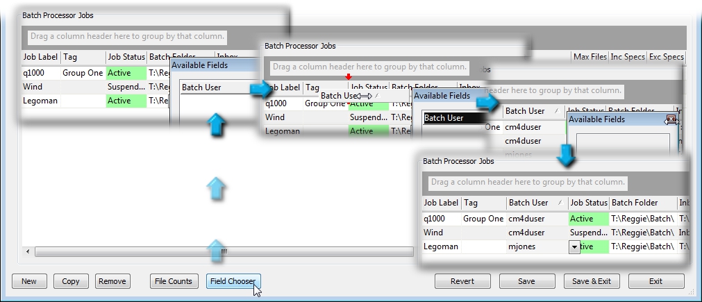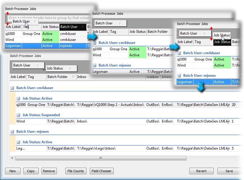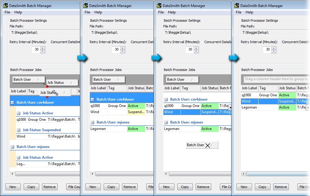 In the DataSmithBatch Manager User Interface, there are several grids which use column headers and grouping controls. DataSmith Batch Manager has the capability to sort the information grids by several column headers on multiple levels (as well as alphabetically). This functionality allows for quick and logical ordering of Batch Jobs in the DataSmith Batch Manager, which can then be easily located and selected for viewing or editing.