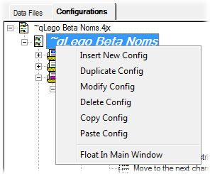 Configs are located under the file name within the Tabs, and have a maroon italic font. Multiple data files can be opened within the same Config in the Data Files tab. Right clicking on the name of a Config in the Configurations tab will display a menu.